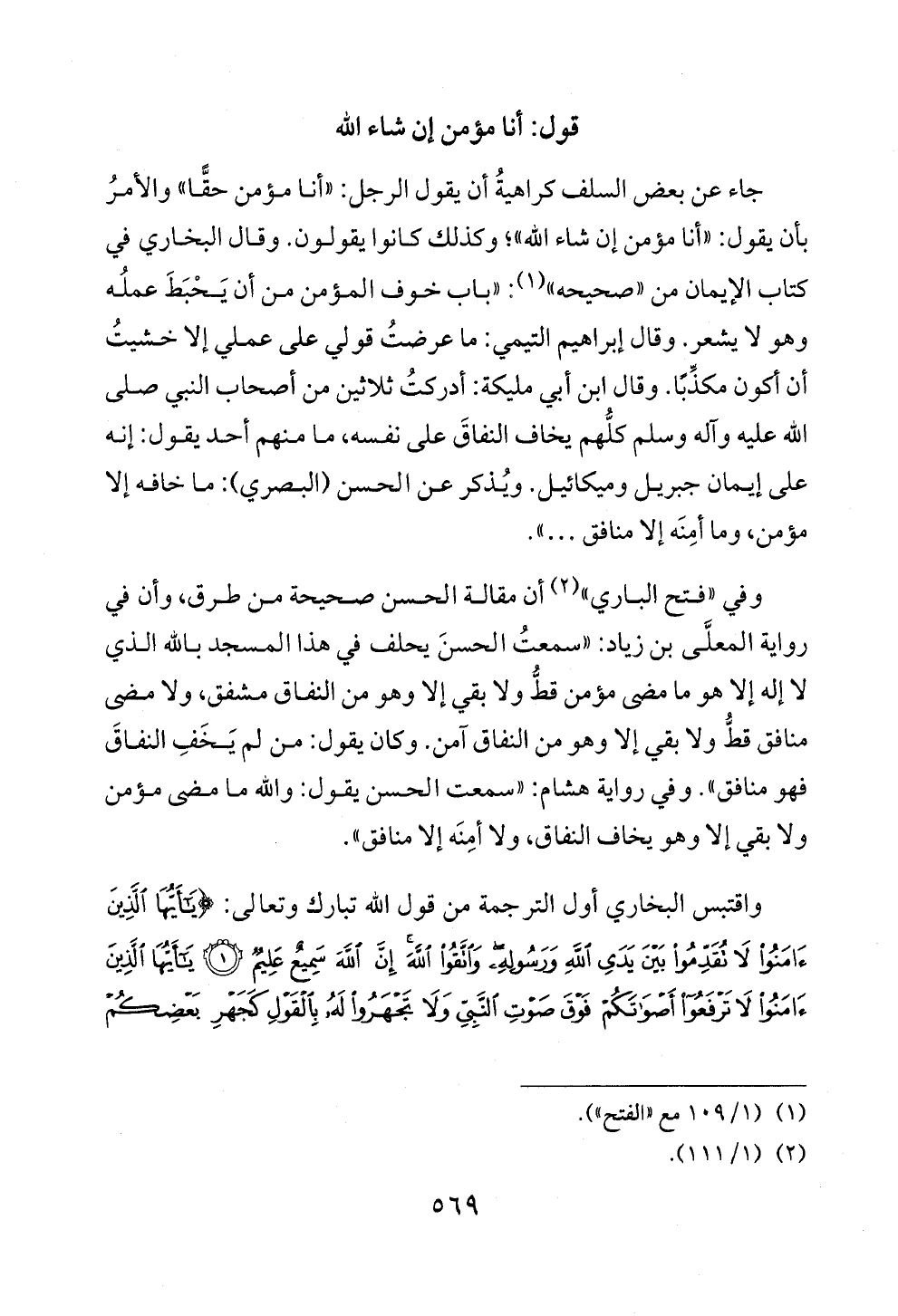 جاء عن بعض السلف كراهيةُ أن يقول الرجل: «أنا مؤمن حقًّا» والأمرُ بأن يقول: «أنا مؤمن إن شاء الله»؛ وكذلك كانوا يقولون. وقال البخاري في كتاب الإيمان من «صحيحه» (¬١): «باب خوف المؤمن من أن يَحْبَطَ عملُه وهو لا يشعر. وقال إبراهيم التيمي: ما عرضتُ قولي على عملي إلا خشيتُ أن أكون مكذِّبًا. وقال ابن أبي مليكة: أدركتُ ثلاثين من أصحاب النبي صلى الله عليه وآله وسلم كلُّهم يخاف النفاقَ على نفسه، ما منهم أحد يقول: إنه على إيمان جبريل وميكائيل. ويُذكر عن الحسن (البصري): ما خافه إلا مؤمن، وما أمِنَه إلا منافق ... ».