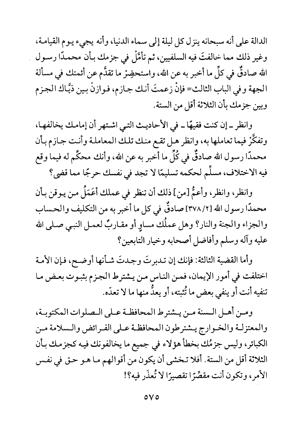 الدالة على أنه سبحانه ينزل كل ليلة إلى سماء الدنيا، وأنه يجيء يوم القيامة، وغير ذلك مما خالفتَ فيه السلفيين، ثم تأمَّلْ في جزمك بأن محمدًا رسول الله صادقٌ في كلِّ ما أخبر به عن الله، واستحضِرْ ما تقدَّم عن أئمتك في مسألة الجهة وفي الباب الثالث= فإنْ زعمتَ أنك جازم، فوازنْ بين ذيَّاك الجزم وبين جزمك بأن الثلاثة أقل من الستة.