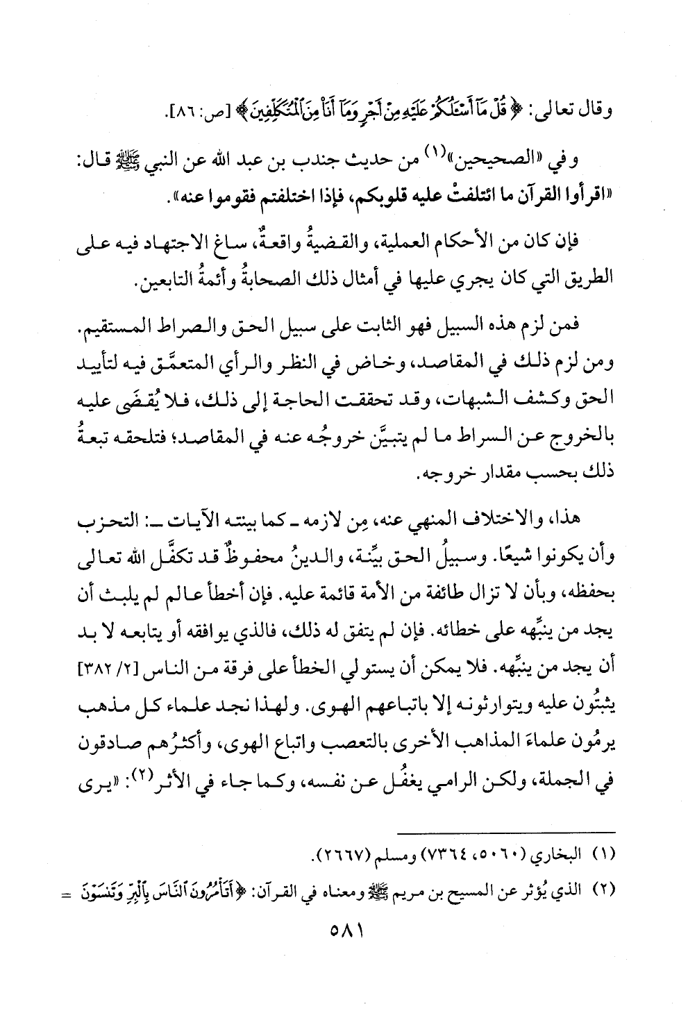 هذا، والاختلاف المنهي عنه، مِن لازمه ــ كما بينته الآيات ــ: التحزب وأن يكونوا شيعًا. وسبيلُ الحق بيِّنة، والدينُ محفوظٌ قد تكفَّل الله تعالى بحفظه، وبأن لا تزال طائفة من الأمة قائمة عليه. فإن أخطأ عالم لم يلبث أن يجد من ينبِّهه على خطائه. فإن لم يتفق له ذلك، فالذي يوافقه أو يتابعه لا بد أن يجد من ينبِّهه. فلا يمكن أن يستولي الخطأ على فرقة من الناس [٢/ ٣٨٢] يثبتُون عليه ويتوارثونه إلا باتباعهم الهوى. ولهذا نجد علماء كل مذهب يرمُون علماءَ المذاهب الأخرى بالتعصب واتباع الهوى، وأكثرُهم صادقون في الجملة، ولكن الرامي يغفُل عن نفسه، وكما جاء في الأثر (¬٢):