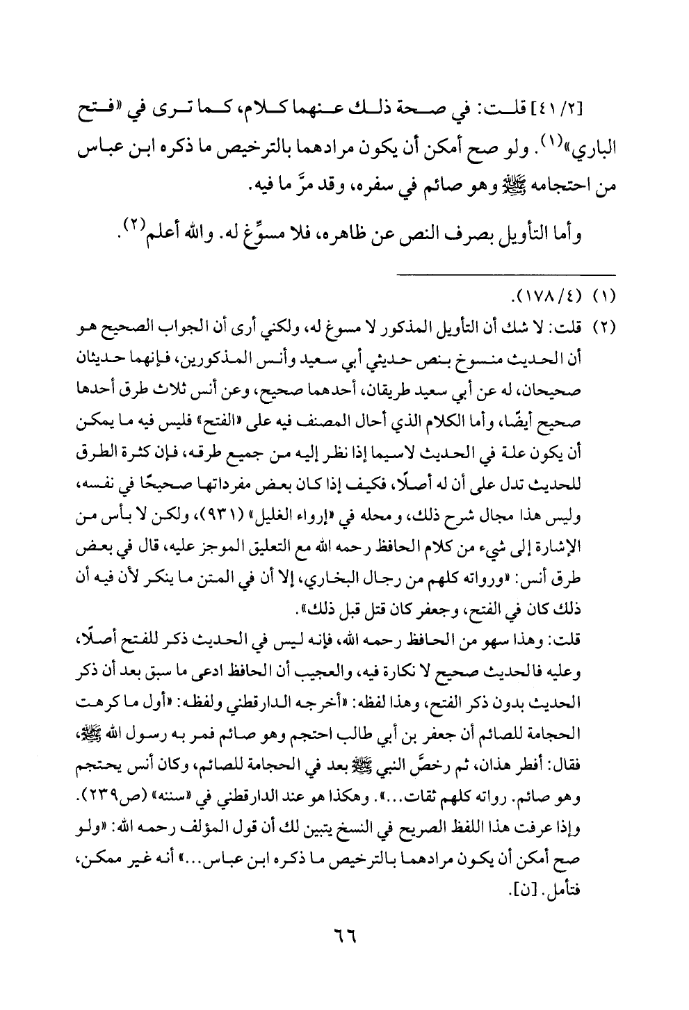 (¬٢) قلت: لا شك أن التأويل المذكور لا مسوغ له، ولكني أرى أن الجواب الصحيح هو أن الحديث منسوخ بنص حديثي أبي سعيد وأنس المذكورين، فإنهما حديثان صحيحان، له عن أبي سعيد طريقان، أحدهما صحيح، وعن أنس ثلاث طرق أحدها صحيح أيضًا، وأما الكلام الذي أحال المصنف فيه على "الفتح" فليس فيه ما يمكن أن يكون علة في الحديث لاسيما إذا نظر إليه من جميع طرقه، فإن كثرة الطرق للحديث تدل على أن له أصلًا، فكيف إذا كان بعض مفرداتها صحيحًا في نفسه، وليس هذا مجال شرح ذلك، ومحله في "إرواء الغليل" (٩٣١)، ولكن لا بأس من الإشارة إلى شيء من كلام الحافظ رحمه الله مع التعليق الموجز عليه، قال في بعض طرق أنس: "ورواته كلهم من رجال البخاري، إلا أن في المتن ما ينكر لأن فيه أن ذلك كان في الفتح، وجعفر كان قتل قبل ذلك".