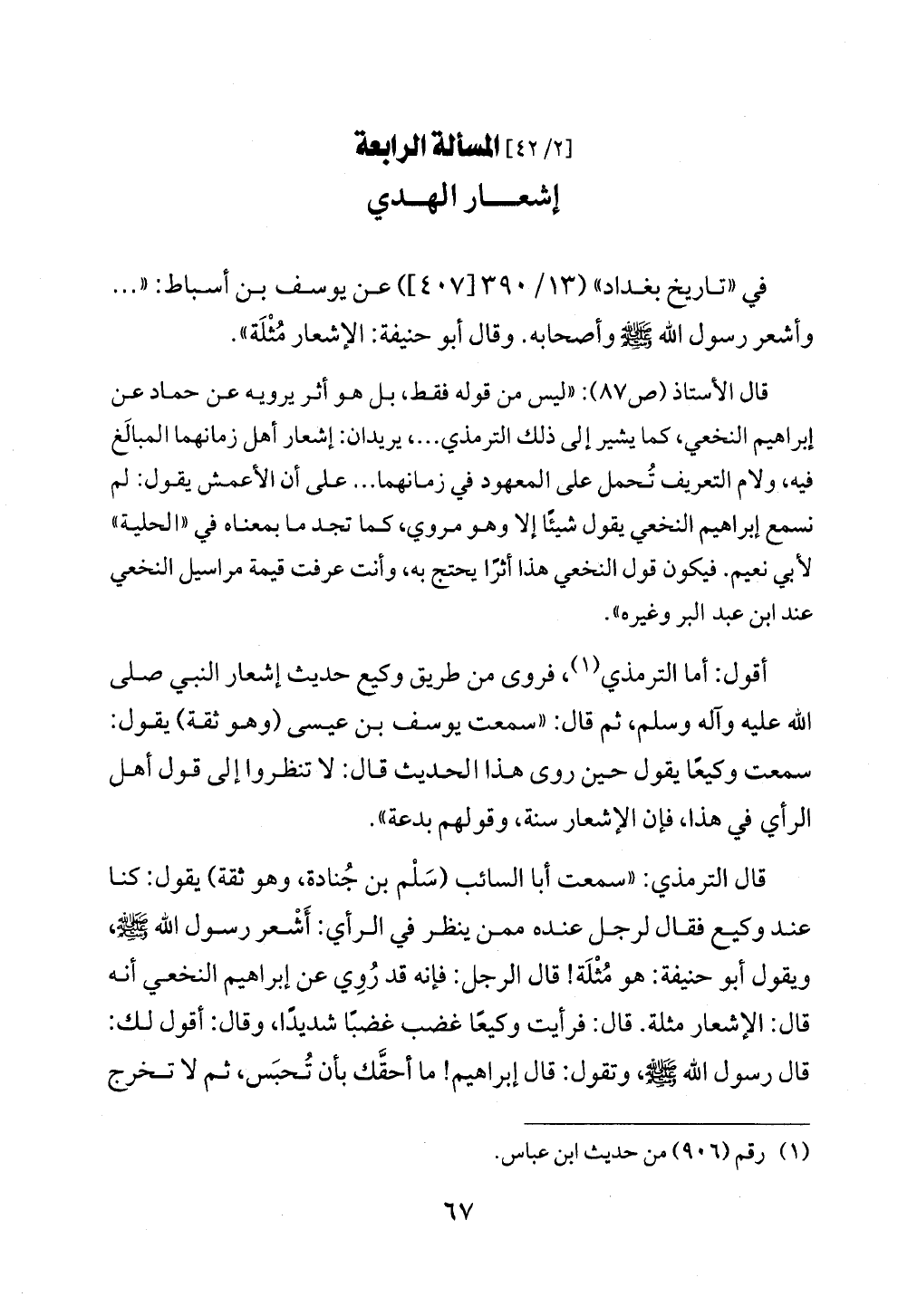 أقول: أما الترمذي (¬١)، فروى من طريق وكيع حديث إشعار النبي صلى الله عليه وآله وسلم، ثم قال: "سمعت يوسف بن عيسى (وهو ثقة) يقول: سمعت وكيعًا يقول حين روى هذا الحديث قال: لا تنظروا إلى قول أهل الرأي في هذا، فإن الإشعار سنة، وقولهم بدعة".