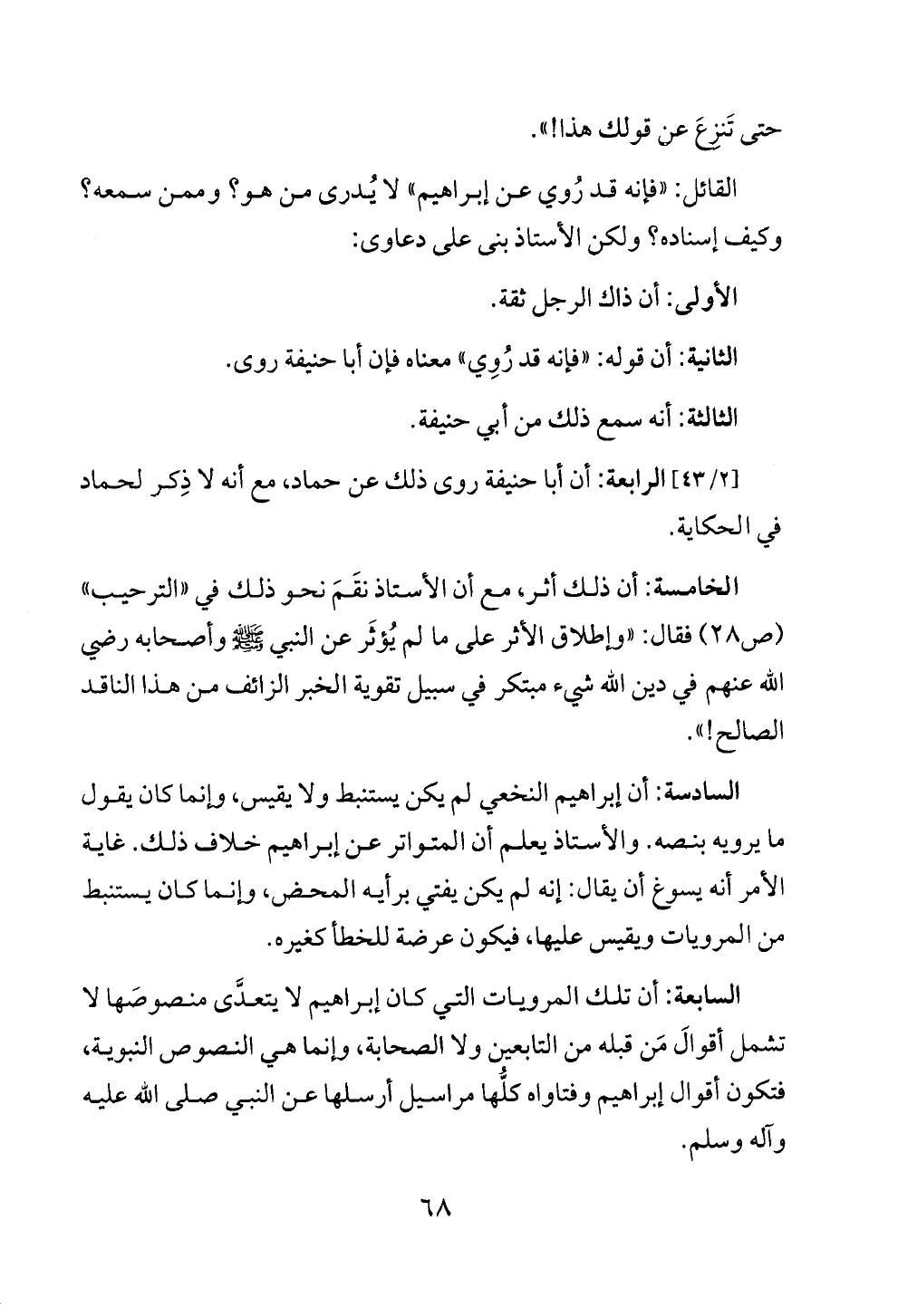 السادسة: أن إبراهيم النخعي لم يكن يستنبط ولا يقيس، وإنما كان يقول ما يرويه بنصه. والأستاذ يعلم أن المتواتر عن إبراهيم خلاف ذلك. غاية الأمر أنه يسوغ أن يقال: إنه لم يكن يفتي برأيه المحض، وإنما كان يستنبط من المرويات ويقيس عليها، فيكون عرضة للخطأ كغيره.
