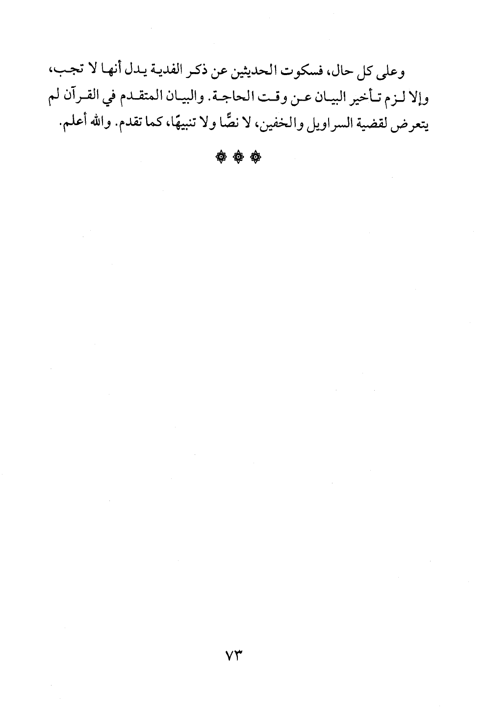 وعلى كل حال، فسكوت الحديثين عن ذكر الفدية يدل أنها لا تجب، وإلا لزم تأخير البيان عن وقت الحاجة. والبيان المتقدم في القرآن لم يتعرض لقضية السراويل والخفين، لا نصًّا ولا تنبيهًا، كما تقدم. والله أعلم.