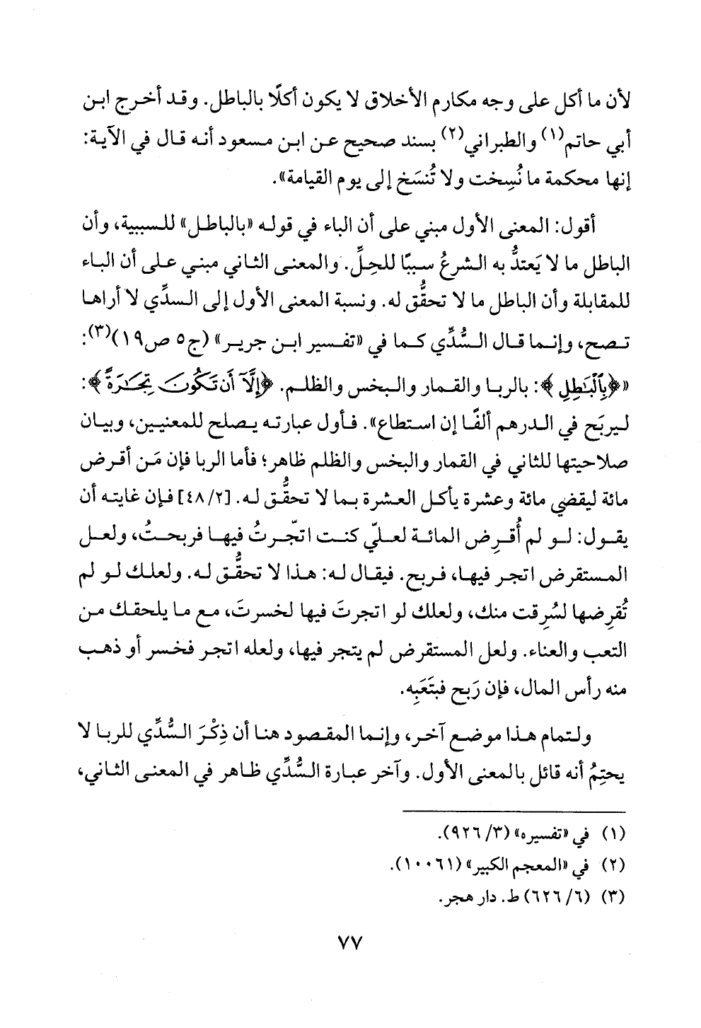 أقول: المعنى الأول مبني على أن الباء في قوله "بالباطل" للسببية، وأن الباطل ما لا يَعتدُّ به الشرعُ سببًا للحِلِّ. والمعنى الثاني مبني على أن الباء للمقابلة وأن الباطل ما لا تحقُّق له. ونسبة المعنى الأول إلى السدِّي لا أراها تصح، وإنما قال السُّدِّي كما في "تفسير ابن جرير" (ج ٥ ص ١٩) (¬٣): " {بِالْبَاطِلِ}: بالربا والقمار والبخس والظلم. {إِلَّا أَنْ تَكُونَ تِجَارَةً}: ليربَح في الدرهم ألفًا إن استطاع". فأول عبارته يصلح للمعنيين، وبيان صلاحيتها للثاني في القمار والبخس والظلم ظاهر؛ فأما الربا فإن مَن أقرض مائة ليقضي مائة وعشرة يأكل العشرة بما لا تحقُّق له. [٢/ ٤٨] فإن غايته أن يقول: لو لم أُقرِض المائة لعلّي كنت اتّجرتُ فيها فربحتُ، ولعل المستقرض اتجر فيها، فربح. فيقال له: هذا لا تحقُّق له. ولعلك لو لم تُقرِضها لسُرِقت منك، ولعلك لو اتجرتَ فيها لخسرتَ، مع ما يلحقك من التعب والعناء. ولعل المستقرض لم يتجر فيها، ولعله اتجر فخسر أو ذهب منه رأس المال، فإن رَبح فبتَعَبِه.