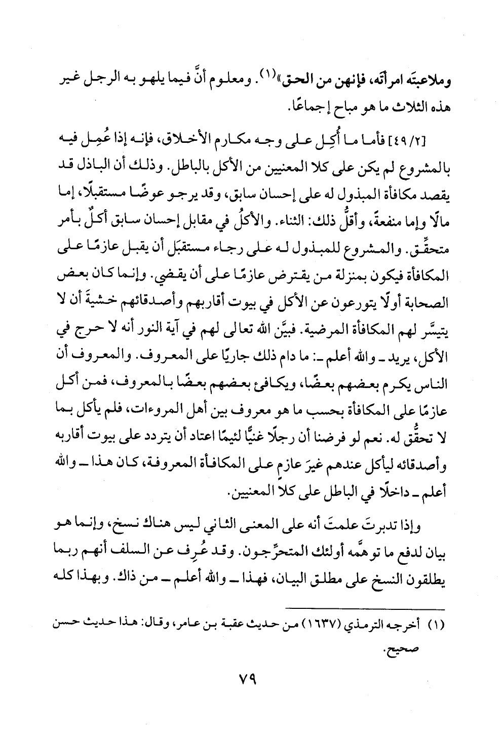 [٢/ ٤٩] فأما ما أُكِل على وجه مكارم الأخلاق، فإنه إذا عُمِل فيه بالمشروع لم يكن على كلا المعنيين من الأكل بالباطل. وذلك أن الباذل قد يقصد مكافأة المبذول له على إحسان سابق، وقد يرجو عوضًا مستقبلًا، إما مالًا وإما منفعةً، وأقلُّ ذلك: الثناء. والأكلُ في مقابل إحسان سابق أكلٌ بأمر متحقِّق. والمشروع للمبذول له على رجاء مستقبَل أن يقبل عازمًا على المكافأة فيكون بمنزلة من يقترض عازمًا على أن يقضي. وإنما كان بعض الصحابة أولًا يتورعون عن الأكل في بيوت أقاربهم وأصدقائهم خشيةَ أن لا يتيسَّر لهم المكافأة المرضية. فبيَّن الله تعالى لهم في آية النور أنه لا حرج في الأكل، يريد ــ والله أعلم ــ: ما دام ذلك جاريًا على المعروف. والمعروف أن الناس يكرم بعضهم بعضًا، ويكافئ بعضهم بعضًا بالمعروف، فمن أكل عازمًا على المكافأة بحسب ما هو معروف بين أهل المروءات، فلم يأكل بما لا تحقُّق له. نعم لو فرضنا أن رجلًا غنيًّا لئيمًا اعتاد أن يتردد على بيوت أقاربه وأصدقائه ليأكل عندهم غيرَ عازمٍ على المكافأة المعروفة، كان هذا ــ والله أعلم ــ داخلًا في الباطل على كلا المعنيين.