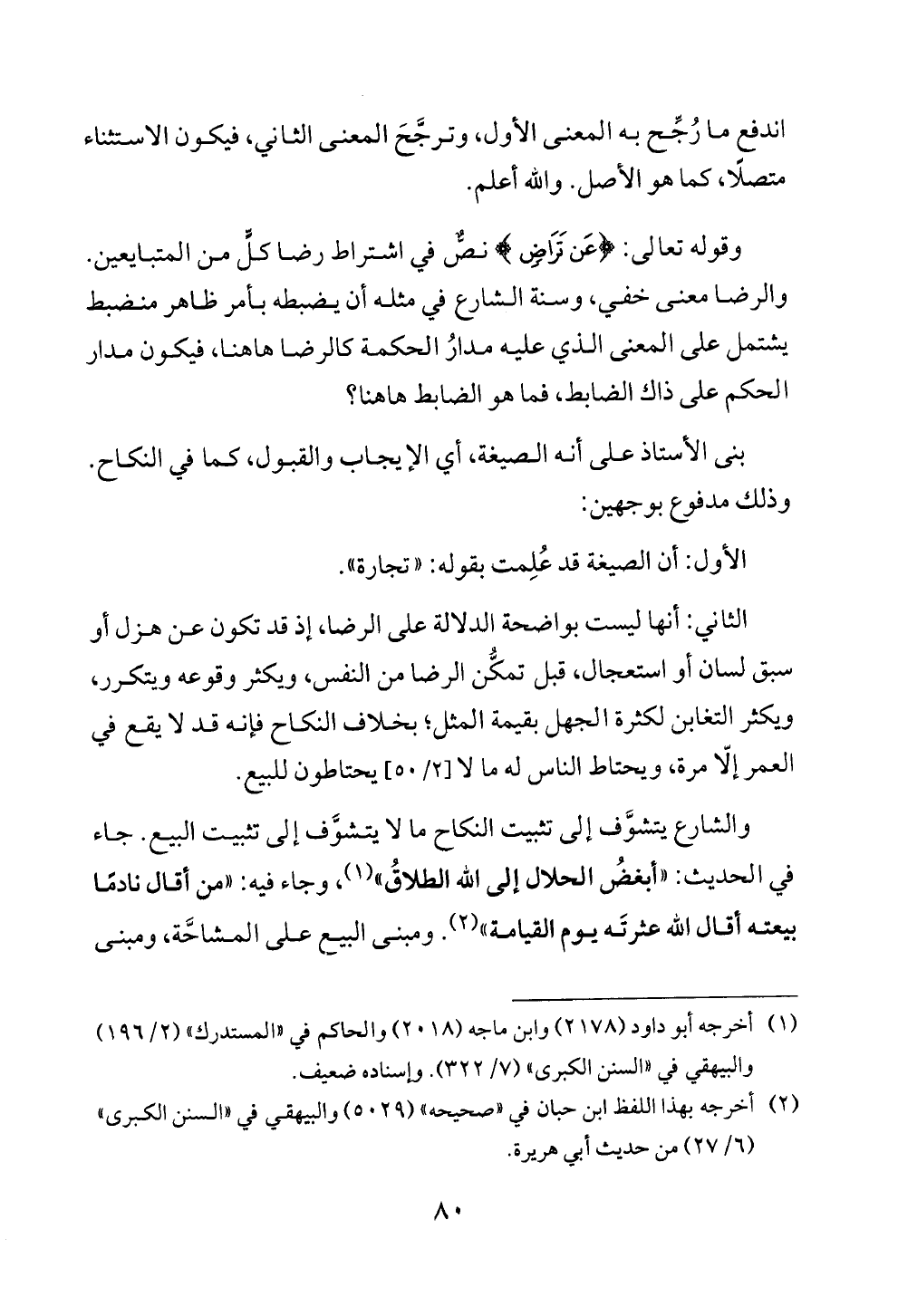 وقوله تعالى: {عَنْ تَرَاضٍ} نصٌّ في اشتراط رضا كلٍّ من المتبايعين. والرضا معنى خفي، وسنة الشارع في مثله أن يضبطه بأمر ظاهر منضبط يشتمل على المعنى الذي عليه مدارُ الحكمة كالرضا هاهنا، فيكون مدار الحكم على ذاك الضابط، فما هو الضابط هاهنا؟