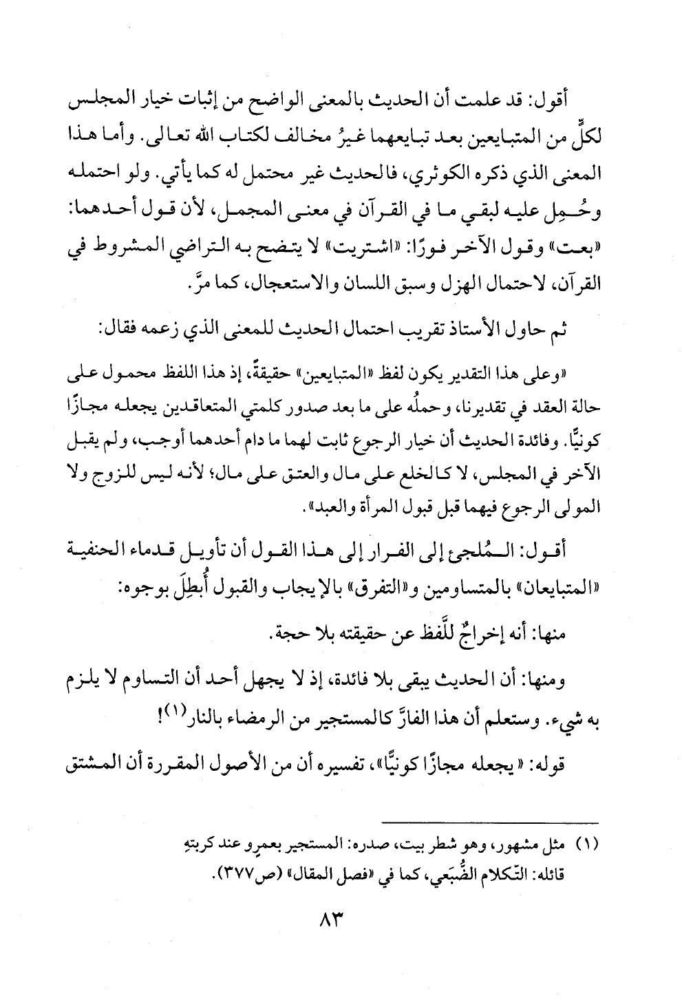 ومنها: أن الحديث يبقى بلا فائدة، إذ لا يجهل أحد أن التساوم لا يلزم به شيء. وستعلم أن هذا الفارَّ كالمستجير من الرمضاء بالنار (¬١)!