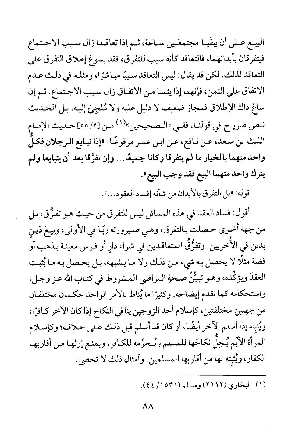 البيع على أن يبقَيا مجتمعَين ساعة، ثم إذا تعاقدا زال سبب الاجتماع فيتفرقان بأبدانهما، فالتعاقد كأنه سبب للتفرق، فقد يسوغ إطلاق التفرق على التعاقد لذلك. لكن قد يقال: ليس التعاقد سببًا مباشرًا، ومثله في ذلك عدم الاتفاق على الثمن، فإنهما إذا يئسا من الاتفاق زال سبب الاجتماع. ثم إن ساغ ذاك الإطلاق فمجاز ضعيف لا دليل عليه ولا مُلجِئَ إليه. بل الحديث نص صريح في قولنا، ففي "الصحيحين" (¬١) من [٢/ ٥٥] حديث الإمام الليث بن سعد، عن نافع، عن ابن عمر مرفوعًا: "إذا تبايع الرجلان فكلُّ واحد منهما بالخيار ما لم يتفرقا وكانا جميعًا ... وإن تفرَّقا بعد أن يتبايعا ولم يترك واحد منهما البيع فقد وجب البيع".