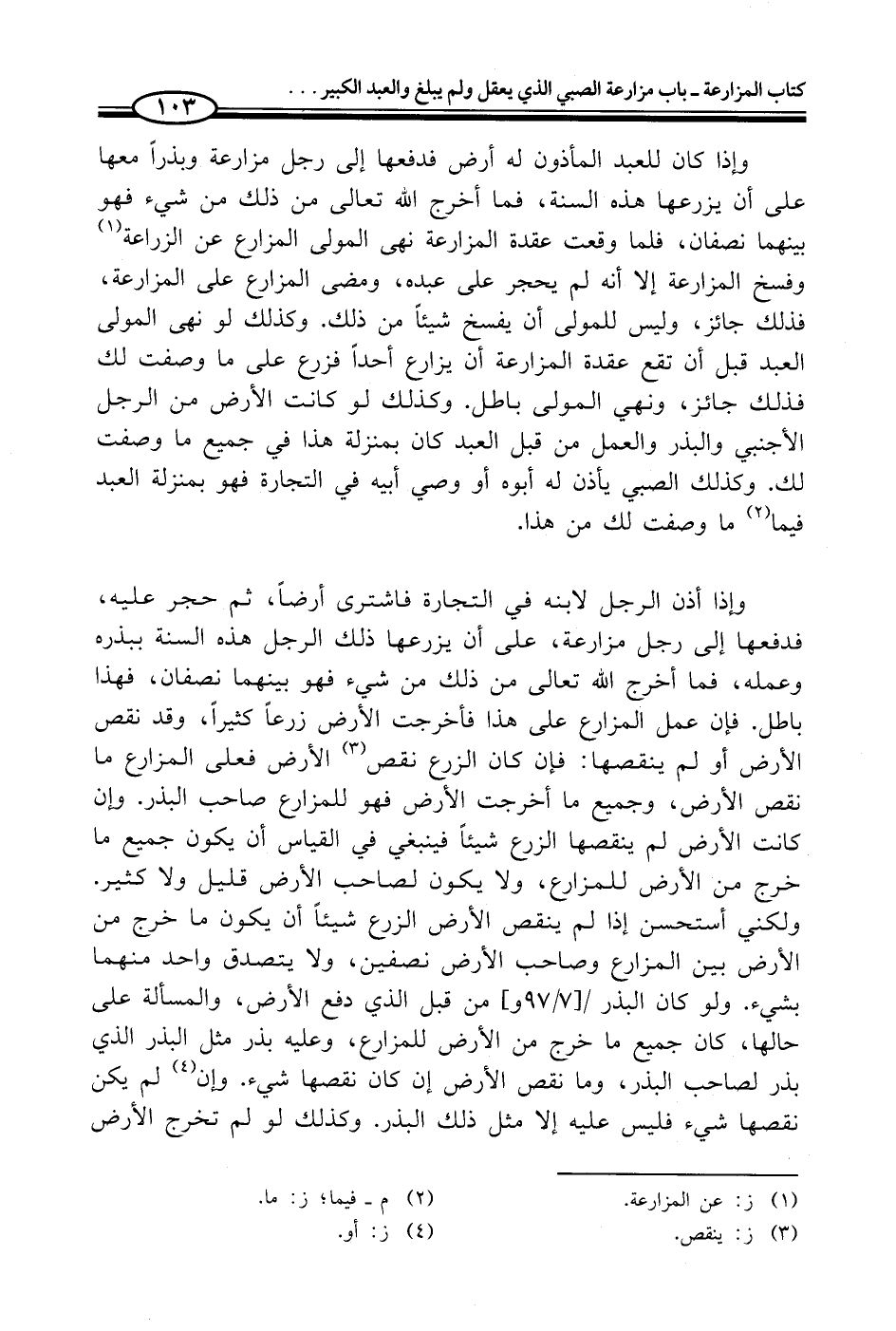 وإذا كان للعبد المأذون له أرض فدفعها إلى رجل مزارعة وبذراً معها على أن يزرعها هذه السنة، فما أخرج الله تعالى من ذلك من شيء فهو بينهما نصفان، فلما وقعت عقدة المزارعة نهى المولى المزارع عن الزراعة (¬1) وفسخ المزارعة إلا أنه لم يحجر على عبده، ومضى المزارع على المزارعة، فذلك جائز، وليس للمولى أن يفسخ شيئاً من ذلك. وكذلك لو نهى المولى العبد قبل أن تقع عقدة المزارعة أن يزارع أحداً فزرع على ما وصفت لك فذلك جائز، ونهي المولى باطل. وكذلك لو كانت الأرض من الرجل الأجنبي والبذر والعمل من قبل العبد كان بمنزلة هذا في جميع ما وصفت لك. وكذلك الصبي يأذن له أبوه أو وصي أبيه في التجارة فهو بمنزلة العبد فيما (¬2) ما وصفت لك من هذا.