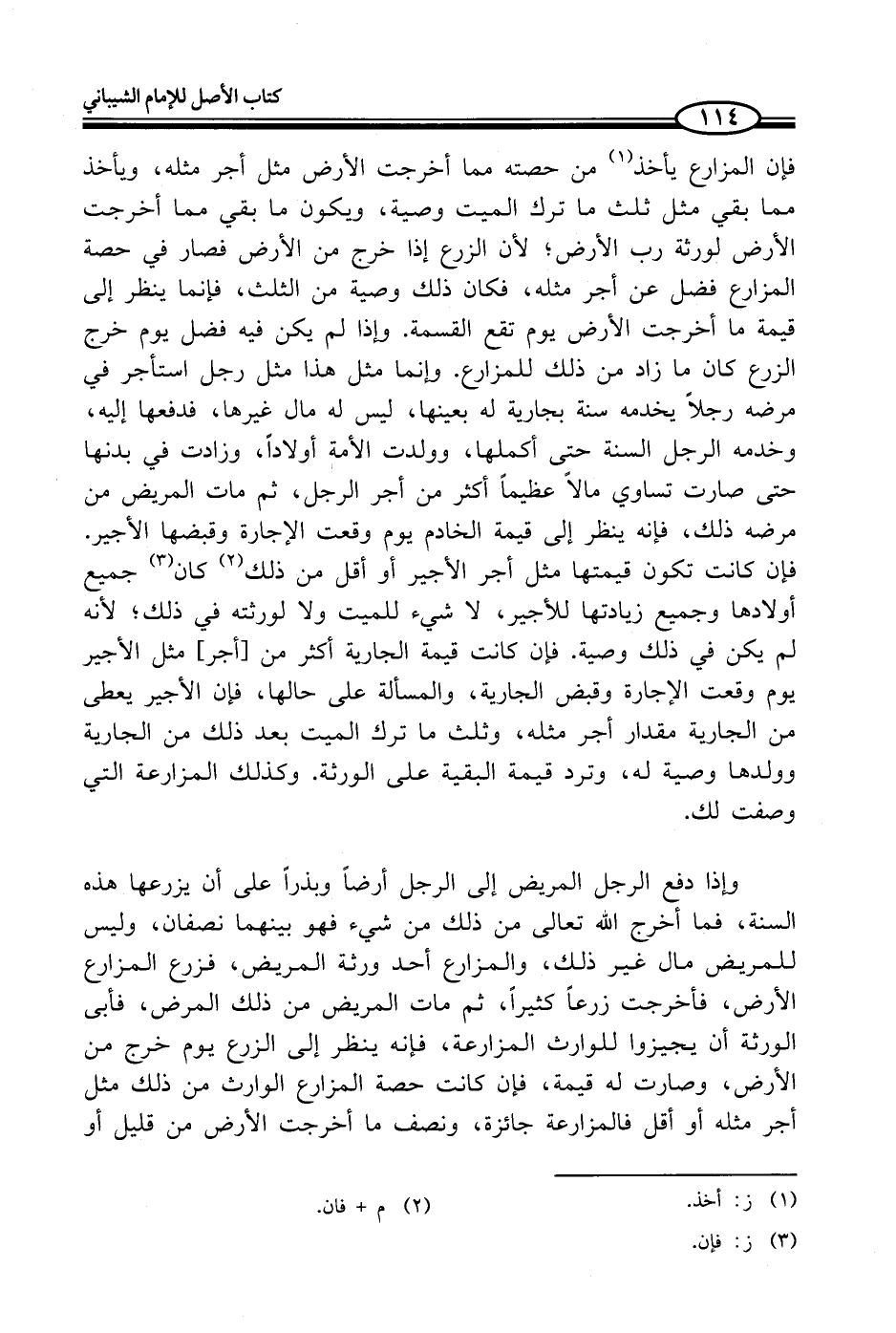 فإن المزارع يأخذ (¬1) من حصته مما أخرجت الأرض مثل أجر مثله، ويأخذ مما بقي مثل ثلث ما ترك الميت وصية، ويكون ما بقي مما أخرجت الأرض لورثة رب الأرض؛ لأن الزرع إذا خرج من الأرض فصار في حصة المزارع فضل عن أجر مثله، فكان ذلك وصية من الثلث، فإنما ينظر إلى قيمة ما أخرجت الأرض يوم تقع القسمة. وإذا لم يكن فيه فضل يوم خرج الزرع كان ما زاد من ذلك للمزارع. وإنما مثل هذا مثل رجل استأجر في مرضه رجلاً يخدمه سنة بجارية له بعينها، ليس له مال غيرها، فدفعها إليه، وخدمه الرجل السنة حتى أكملها، وولدت الأمة أولاداً، وزادت في بدنها حتى صارت تساوي مالاً عظيماً أكثر من أجر الرجل، ثم مات المريض من مرضه ذلك، فإنه ينظر إلى قيمة الخادم يوم وقعت الإجارة وقبضها الأجير. فإن كانت تكون قيمتها مثل أجر الأجير أو أقل من ذلك (¬2) كان (¬3) جميع أولادها وجميع زيادتها للأجير، لا شيء للميت ولا لورثته في ذلك؛ لأنه لم يكن في ذلك وصية. فإن كانت قيمة الجارية أكثر من [أجر] مثل الأجير يوم وقعت الإجارة وقبض الجارية، والمسألة على حالها، فإن الأجير يعطى من الجارية مقدار أجر مثله، وثلث ما ترك الميت بعد ذلك من الجارية وولدها وصية له، وترد قيمة البقية على الورثة. وكذلك المزارعة التي وصفت لك.