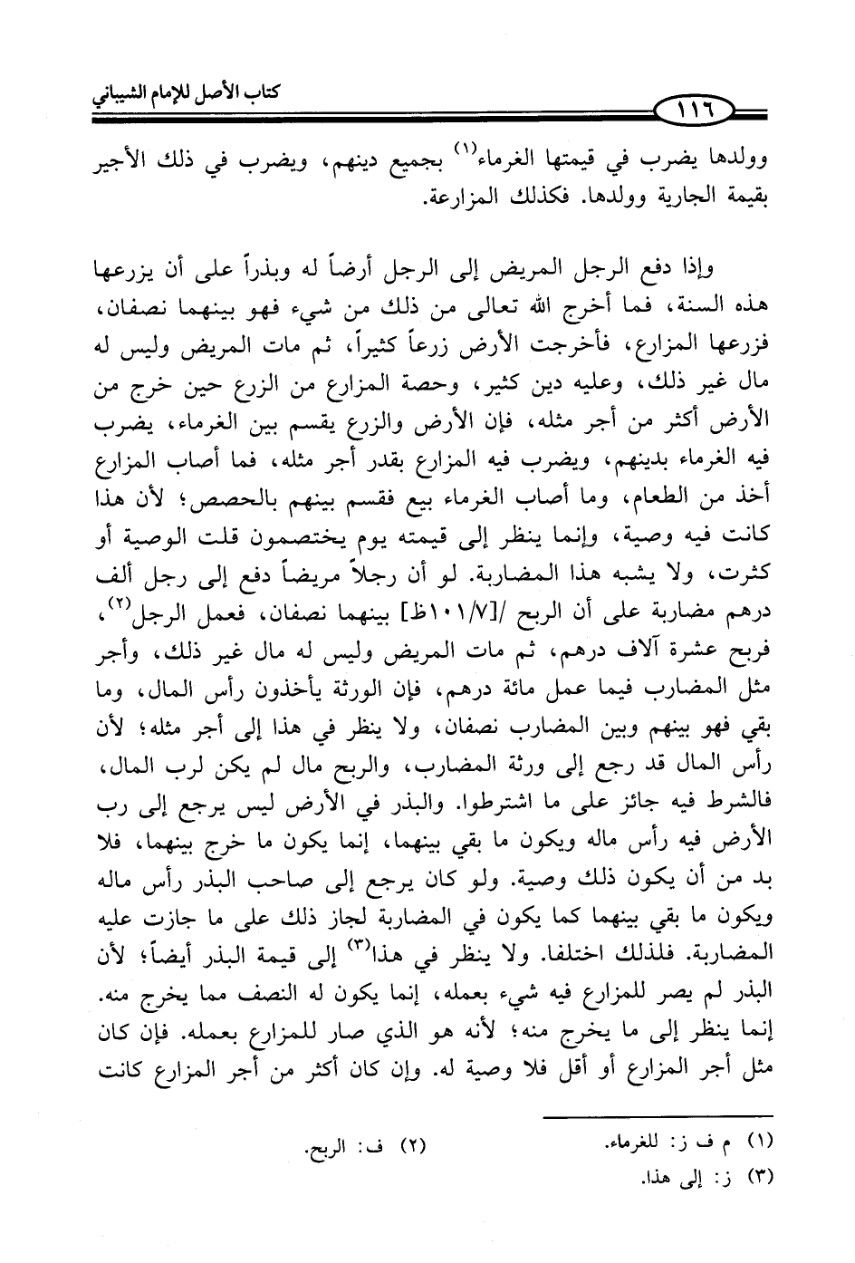 وإذا دفع الرجل المريض إلى الرجل أرضاً له وبذراً على أن يزرعها هذه السنة، فما أخرج الله تعالى من ذلك من شيء فهو بينهما نصفان، فزرعها المزارع، فأخرجت الأرض زرعاً كثيراً، ثم مات المريض وليس له مال غير ذلك، وعليه دين كثير، وحصة المزارع من الزرع حين خرج من الأرض أكثر من أجر مثله، فإن الأرض والزرع يقسم بين الغرماء، يضرب فيه الغرماء بدينهم، ويضرب فيه المزارع بقدر أجر مثله، فما أصاب المزارع أخذ من الطعام، وما أصاب الغرماء بيع فقسم بينهم بالحصص؛ لأن هذا كانت فيه وصية، وإنما ينظر إلى قيمته يوم يختصمون قلت الوصية أو كثرت، ولا يشبه هذا المضاربة. لو أن رجلاً مريضاً دفع إلى رجل ألف درهم مضاربة على أن الربح بينهما نصفان، فعمل الرجل (¬2)، فربح عشرة آلاف درهم، ثم مات المريض وليس له مال غير ذلك، وأجر مثل المضارب فيما عمل مائة درهم، فإن الورثة يأخذون رأس المال، وما بقي فهو بينهم وبين المضارب نصفان، ولا ينظر في هذا إلى أجر مثله؛ لأن رأس المال قد رجع إلى ورثة المضارب، والربح مال لم يكن لرب المال، فالشرط فيه جائز على ما اشترطوا. والبذر في الأرض ليس يرجع إلى رب الأرض فيه رأس ماله ويكون ما بقي بينهما، إنما يكون ما خرج بينهما، فلا بد من أن يكون ذلك وصية. ولو كان يرجع إلى صاحب البذر رأس ماله ويكون ما بقي بينهما كما يكون في المضاربة لجاز ذلك على ما جازت عليه المضاربة. فلذلك اختلفا. ولا ينظر في هذا (¬3) إلى قيمة البذر أيضاً؛ لأن البذر لم يصر للمزارع فيه شيء بعمله، إنما يكون له النصف مما يخرج منه. إنما ينظر إلى ما يخرج منه؛ لأنه هو الذي صار للمزارع بعمله. فإن كان مثل أجر المزارع أو أقل فلا وصية له. وإن كان أكثر من أجر المزارع كانت