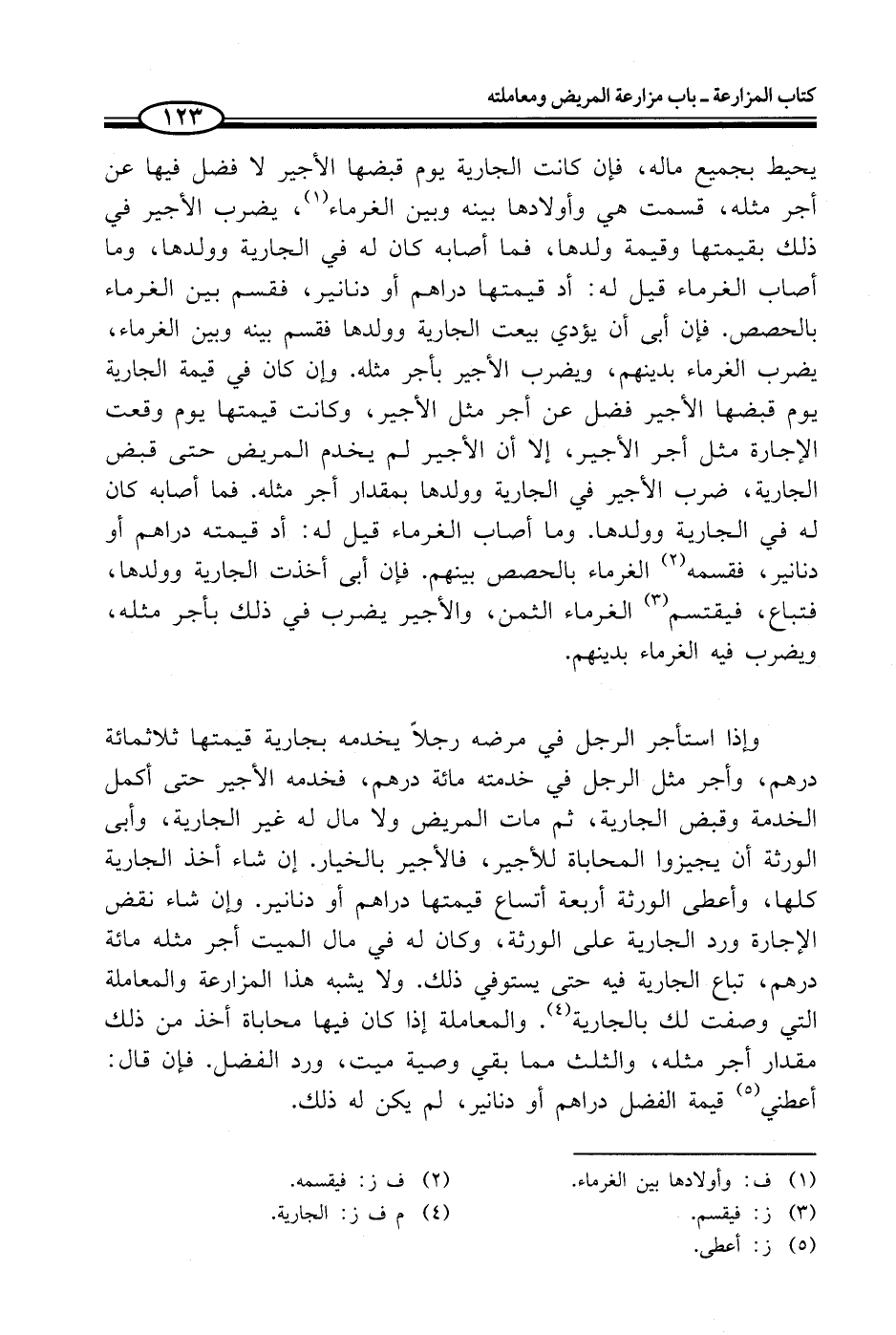 وإذا استأجر الرجل في مرضه رجلاً يخدمه بجارية قيمتها ثلاثمائة درهم، وأجر مثل الرجل في خدمته مائة درهم، فخدمه الأجير حتى أكمل الخدمة وقبض الجارية، ثم مات المريض ولا مالى له غير الجارية، وأبى الورثة أن يجيزوا المحاباة للأجير، فالأجير بالخيار. إن شاء أخذ الجارية كلها، وأعطى الورثة أربعة أتساع قيمتها دراهم أو دنانير. وإن شاء نقض الإجارة ورد الجارية على الورثة، وكان له في مال الميت أجر مثله مائة درهم، تباع الجارية فيه حتى يستوفي ذلك. ولا يشبه هذا المزارعة والمعاملة التي وصفت لك بالجارية (¬4). والمعاملة إذا كان فيها محاباة أخذ من ذلك مقدار أجر مثله، والثلث مما بقي وصية ميت، ورد الفضل. فإن قال: أعطني (¬5) قيمة الفضل دراهم أو دنانير، لم يكن له ذلك.
