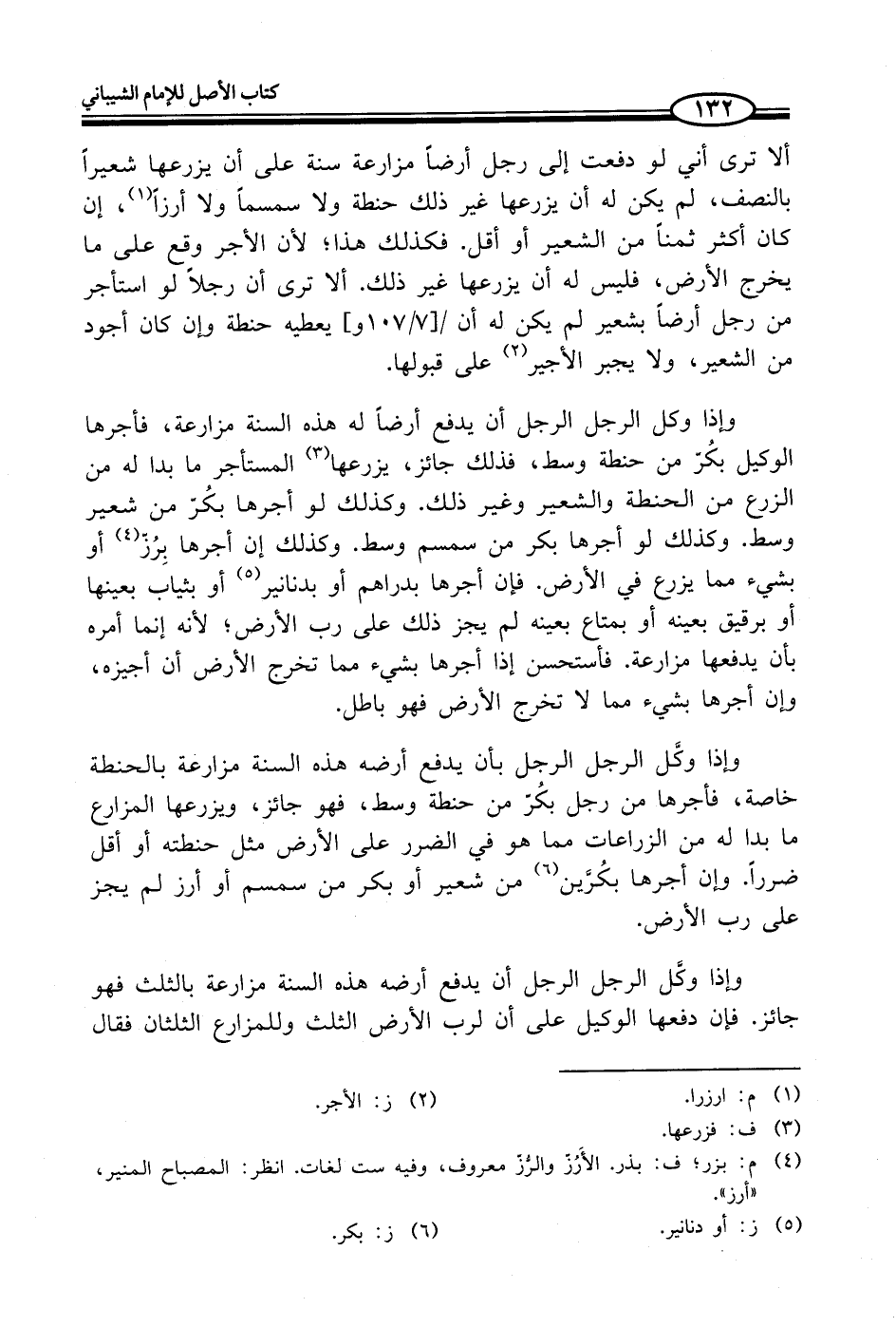 ألا ترى أني لو دفعت إلى رجل أرضاً مزارعة سنة على أن يزرعها شعيراً بالنصف، لم يكن له أن يزرعها غير ذلك حنطة ولا سمسماً ولا أرزاً (¬1)، إن كان أكثر ثمناً من الشعير أو أقل. فكذلك هذا؛ لأن الأجر وقع على ما يخرج الأرض، فليس له أن يزرعها غير ذلك. ألا ترى أن رجلاً لو استأجر من رجل أرضاً بشعير لم يكن له أن يعطيه حنطة وإن كان أجود من الشعير، ولا يجبر الأجير (¬2) على قبولها.