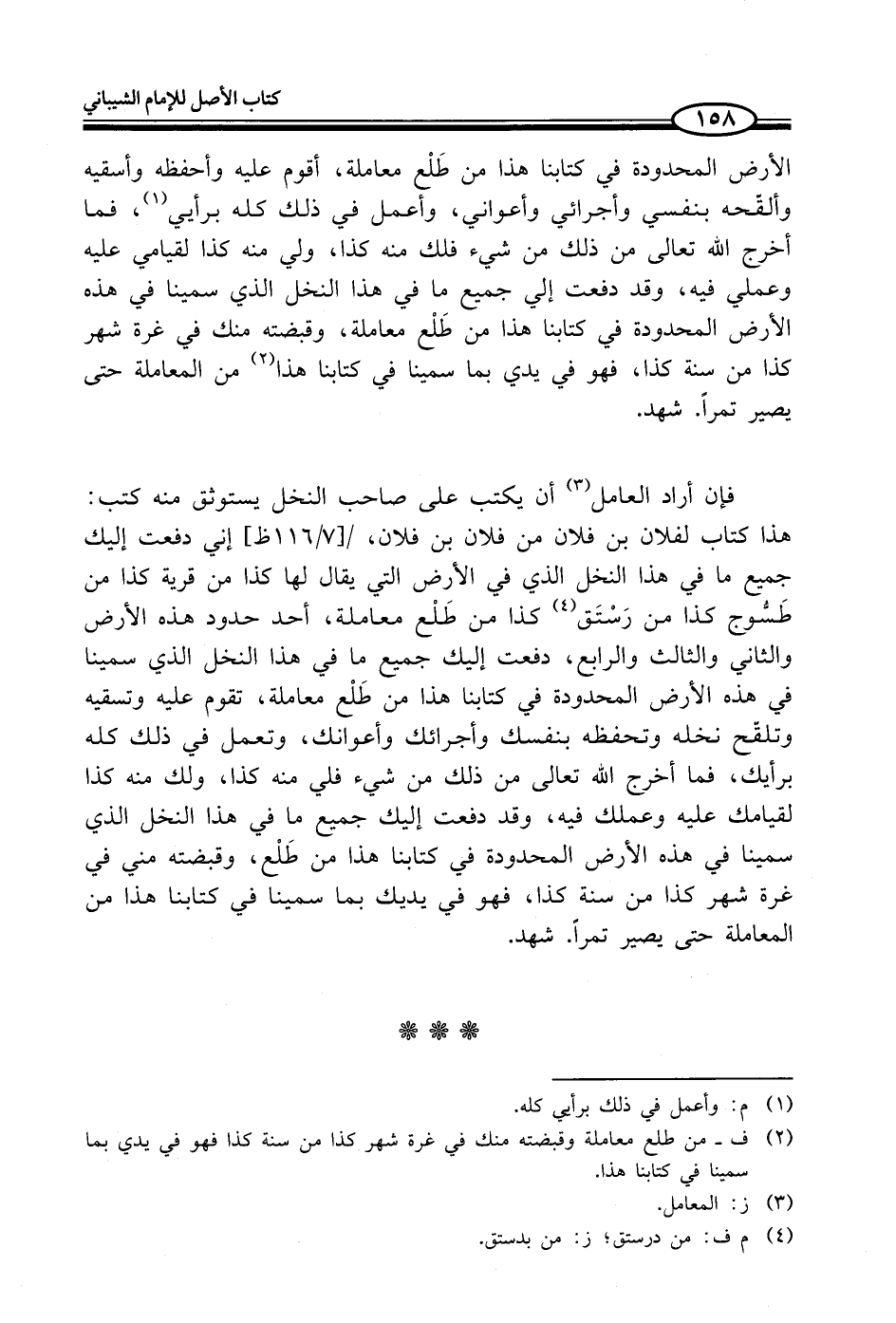 فإن أراد العامل (¬3) أن يكتب على صاحب النخل يستوثق منه كتب: هذا كتاب لفلان بن فلان من فلان بن فلان، إني دفعت إليك جميع ما في هذا النخل الذي في الأرض التي يقال لها كذا من قرية كذا من طَسُّوج كذا من رَسْتَق (¬4) كذا من طَلْع معاملة، أحد حدود هذه الأرض والثاني والثالث والرابع، دفعت إليك جميع ما في هذا النخل الذي سمينا في هذه الأرض المحدودة في كتابنا هذا من طَلْع معاملة، تقوم عليه وتسقيه وتلقّح نخله وتحفظه بنفسك وأجرائك وأعوانك، وتعمل في ذلك كله برأيك، فما أخرج الله تعالى من ذلك من شيء فلي منه كذا، ولك منه كذا لقيامك عليه وعملك فيه، وقد دفعت إليك جميع ما في هذا النخل الذي سمينا في هذه الأرض المحدودة في كتابنا هذا من طَلْع، وقبضته مني في غرة شهر كذا من سنة كذا، فهو في يديك بما سمينا في كتابنا هذا من المعاملة حتى يصير تمراً. شهد.