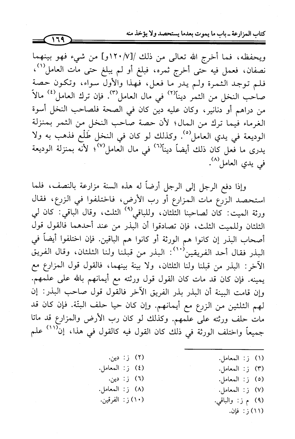وإذا دفع الرجل إلى الرجل أرضاً له هذه السنة مزارعة بالنصف، فلما استحصد الزرع مات المزارع أو رب الأرض، فاختلفوا في الزرع، فقال ورثة الميت: كان لصاحبنا الثلثان، وللباقي (¬9) الثلث، وقال الباقي: كان لي الثلثان وللميت الثلث، فإن تصادقوا أن البذر من عند أحدهما فالقول قول أصحاب البذر إن كانوا هم الورثة أو كانوا هم الباقين. فإن اختلفوا أيضاً في البذر فقال أحد الفريقين (¬10): البذر من قبلنا ولنا الثلثان، وقال الفريق الآخر: البذر من قبلنا ولنا الثلثان، ولا بينة بينهما، فالقول قول المزارع مع يمينه. فإن كان قد مات كان القول قول ورثته مع أيمانهم بالله على علمهم. وإن قامت البينة أن البذر بذر الفريق الآخر فالقول قول صاحب البذر: إن لهم الثلثين من الزرع مع أيمانهم. وإن كان حيا حلف البتّة. فإن كان قد مات حلف ورثته على علمهم. وكذلك لو كان رب الأرض والمزارع قد ماتا جميعاً واختلف الورثة في ذلك كان القول فيه كالقول في هذا، إن (¬11) علم