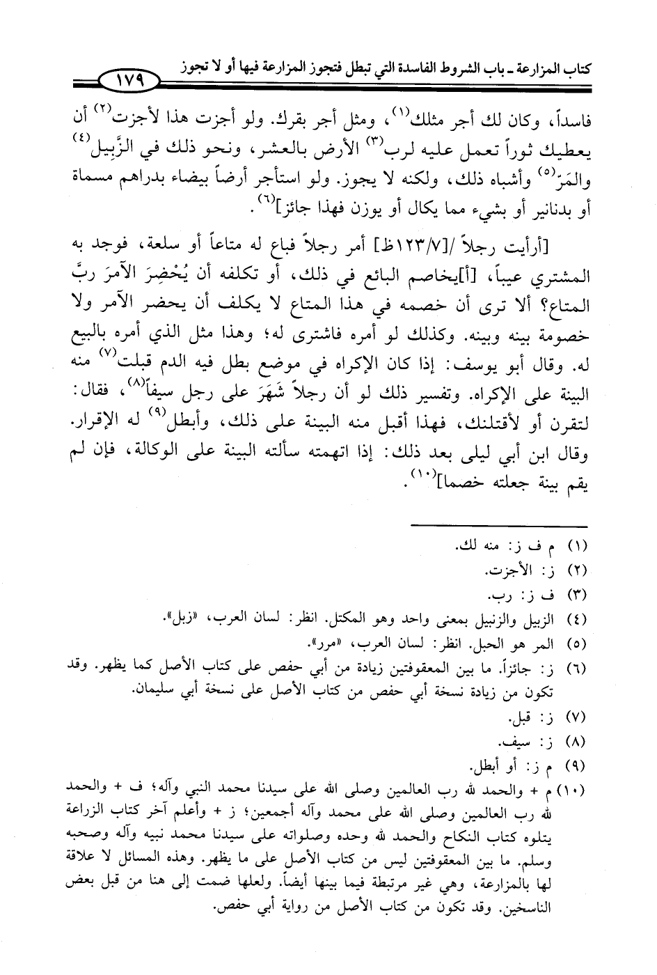 (¬10) م + والحمد لله رب العالمين وصلى الله على سيدنا محمد النبي وآله؛ ف + والحمد لله رب العالمين وصلى الله على محمد وآله أجمعين، ز + وأعلم آخر كتاب الزراعة يتلوه كتاب النكاح والحمد لله وحده وصلواته على سيدنا محمد نبيه وآله وصحبه وسلم. ما بين المعقوفتين ليس من كتاب الأصل على ما يظهر. وهذه المسائل لا علاقة لها بالمزارعة، وهي غير مرتبطة فيما بينها أيضاً. ولعلها ضمت إلى هنا من قبل بعض الناسخين. وقد تكون من كتاب الأصل من رواية أبي حفص.