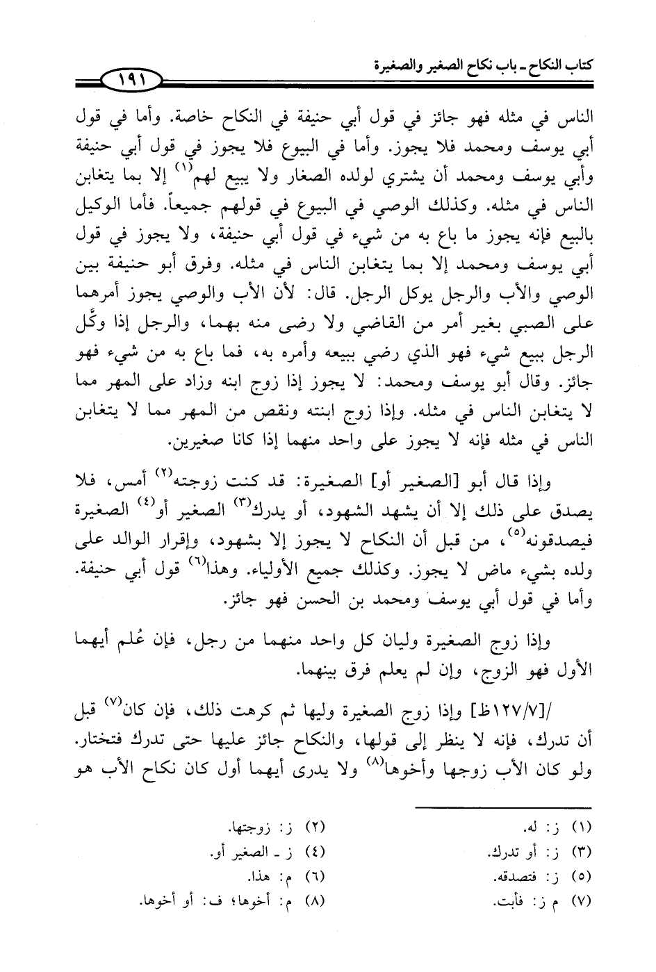 وإذا قال أبو [الصغير أو] الصغيرة: قد كنت زوجته (¬2) أمس، فلا يصدق على ذلك إلا أن يشهد الشهود، أو يدرك (¬3) الصغير أو (¬4) الصغيرة فيصدقونه (¬5)، من قبل أن النكاح لا يجوز إلا بشهود، وإقرار الوالد على ولده بشيء ماض لا يجوز. وكذلك جميع الأولياء. وهذا (¬6) قول أبي حنيفة. وأما في قولي أبي يوسف ومحمد بن الحسن فهو جائز.