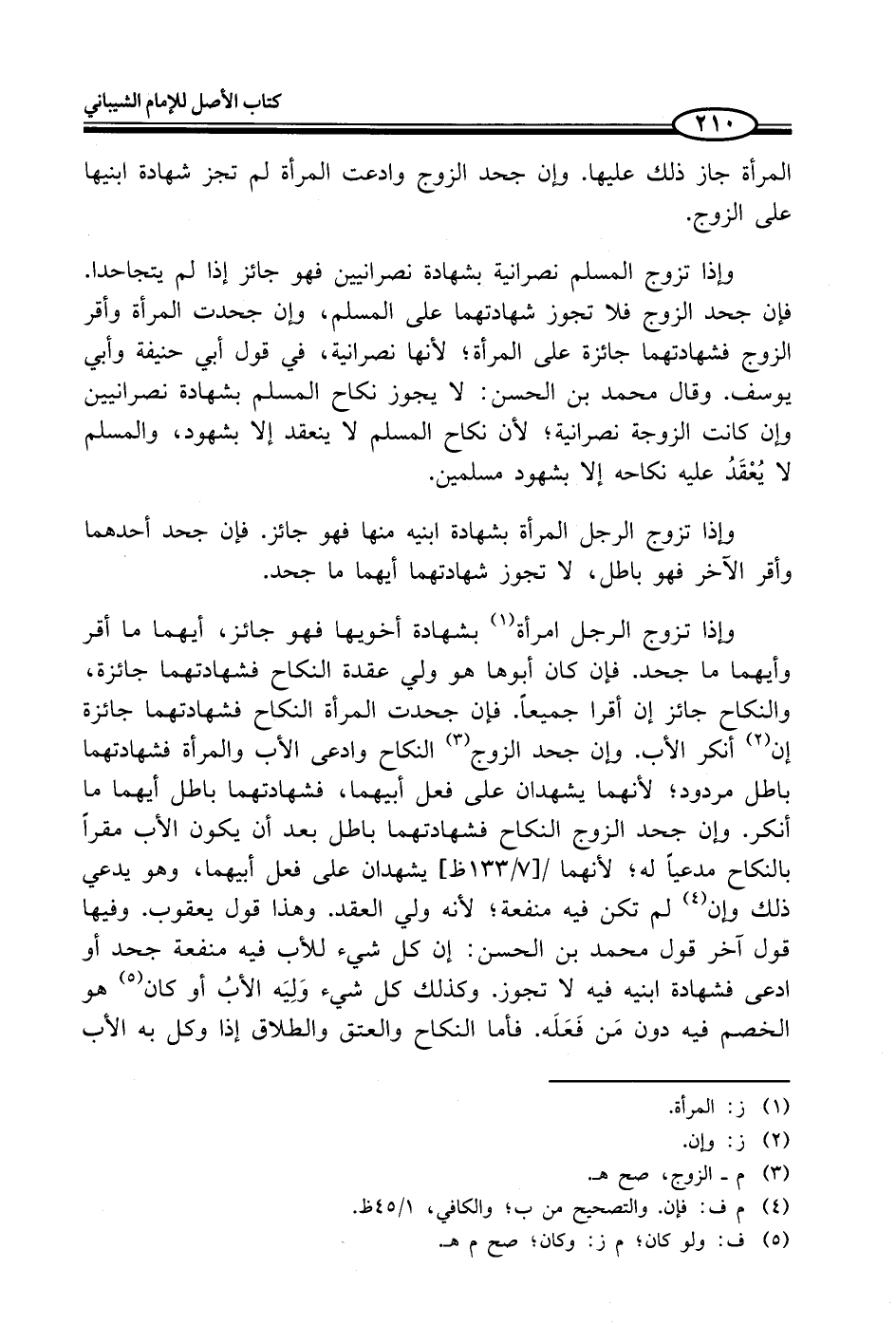 وإذا تزوج المسلم نصرانية بشهادة نصرانيين فهو جائز إذا لم يتجاحدا. فإن جحد الزوج فلا تجوز شهادتهما على المسلم، وإن جحدت المرأة وأقر الزوج فشهادتهما جائزة على المرأة؛ لأنها نصرانية، في قول أبي حنيفة وأبي يوسف. وقال محمد بن الحسن: لا يجوز نكاح المسلم بشهادة نصرانيين وإن كانت الزوجة نصرانية؛ لأن نكاح المسلم لا ينعقد إلا بشهود، والمسلم لا يُعْقَدُ عليه نكاحه إلا بشهود مسلمين.