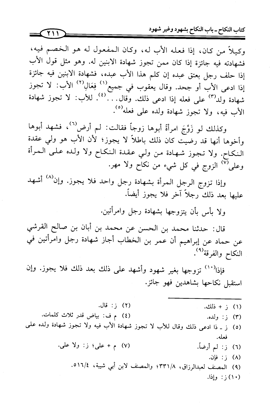 قال: حدثنا محمد بن الحسن عن محمد بن أبان بن صالح القرشي عن حماد عن إبراهيم أن عمر بن الخطاب أجاز شهادة رجل وامرأتين في النكاح والفرقة (¬9).