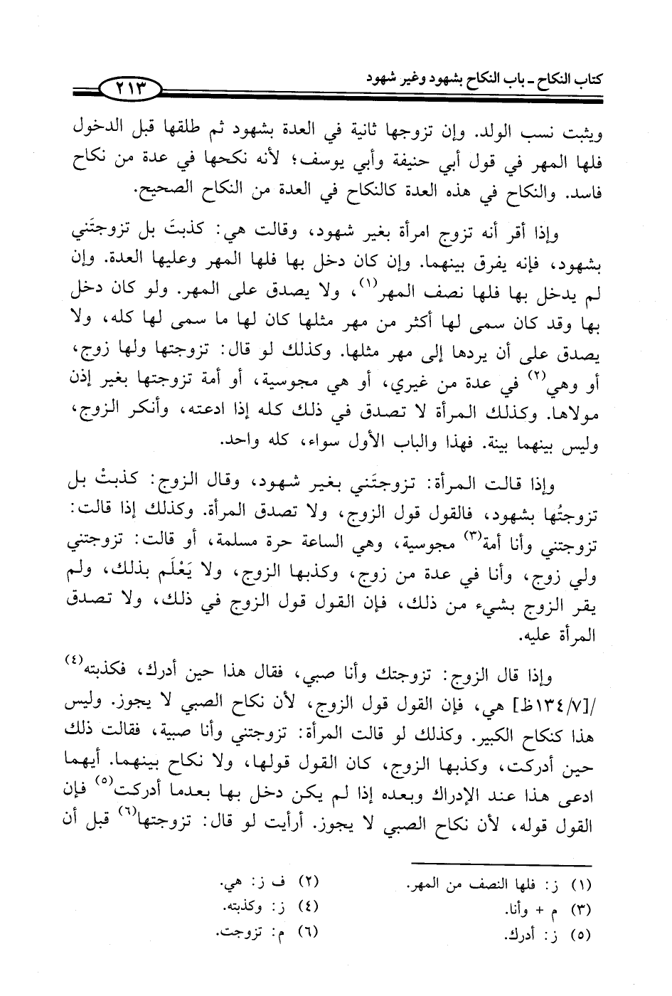 وإذا قالت المرأة: تزوجتَني بغير شهود، وقال الزوج: كذبتْ بل تزوجتُها بشهود، فالقول قول الزوج، ولا تصدق المرأة. وكذلك إذا قالت: تزوجتني وأنا أمة (¬3) مجوسية، وهي الساعة حرة مسلمة، أو قالت: تزوجتني ولي زوج، وأنا في عدة من زوج، وكذبها الزوج، ولا يَعْلَم بذلك، ولم يقر الزوج بشيء من ذلك، فإن القول قول الزوج في ذلك، ولا تصدق المرأة عليه.
