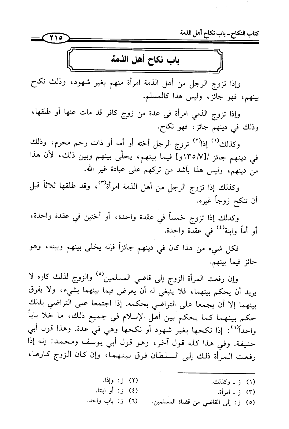 وإن رفعت المرأة الزوج إلى قاضي المسلمين (¬5) والزوج لذلك كاره لا يريد أن يحكم بينهما، فلا ينبغي له أن يعرض فيما بينهما بشيء، ولا يفرق بينهما إلا أن يجمعا على التراضي بحكمه. إذا اجتمعا على التراضي بذلك حكم بينهما كما يحكم بين أهل الإسلام في جميع ذلك، ما خلا باباً واحداً (¬6): إذا نكحها بغير شهود أو نكحها وهي في عدة. وهذا قول أبي حنيفة. وفي هذا كله قول آخر، وهو قول أبي يوسف ومحمد: إنه إذا رفعت المرأة ذلك إلى السلطان فرق بينهما، وإن كان الزوج كارها،