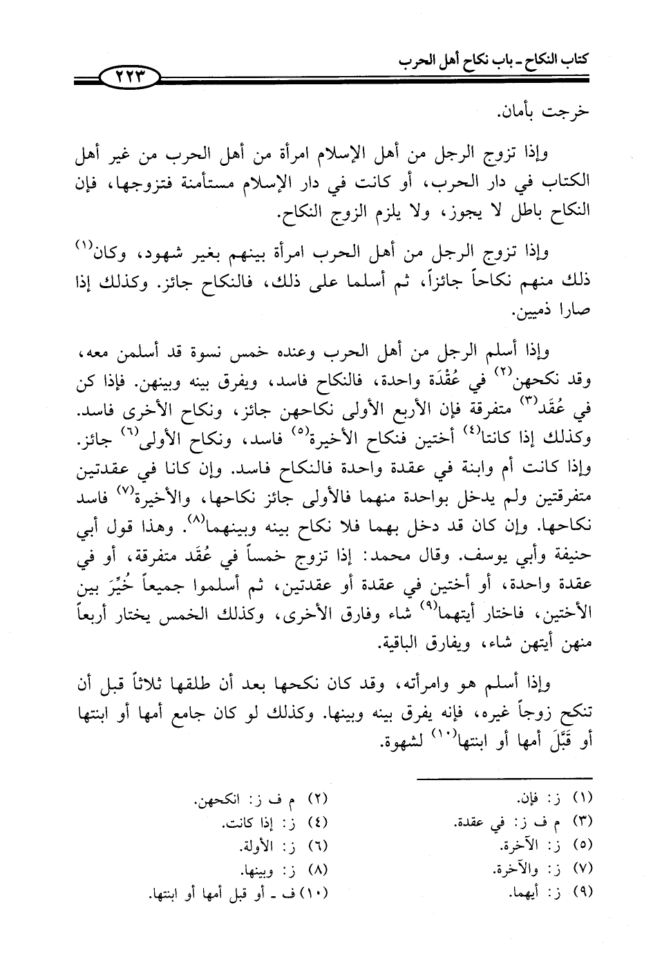 وإذا تزوج الرجل من أهل الحرب امرأة بينهم بغير شهود، وكان (¬1) ذلك منهم نكاحاً جائزاً، ثم أسلما على ذلك، فالنكاح جائز. وكذلك إذا صارا ذميين.