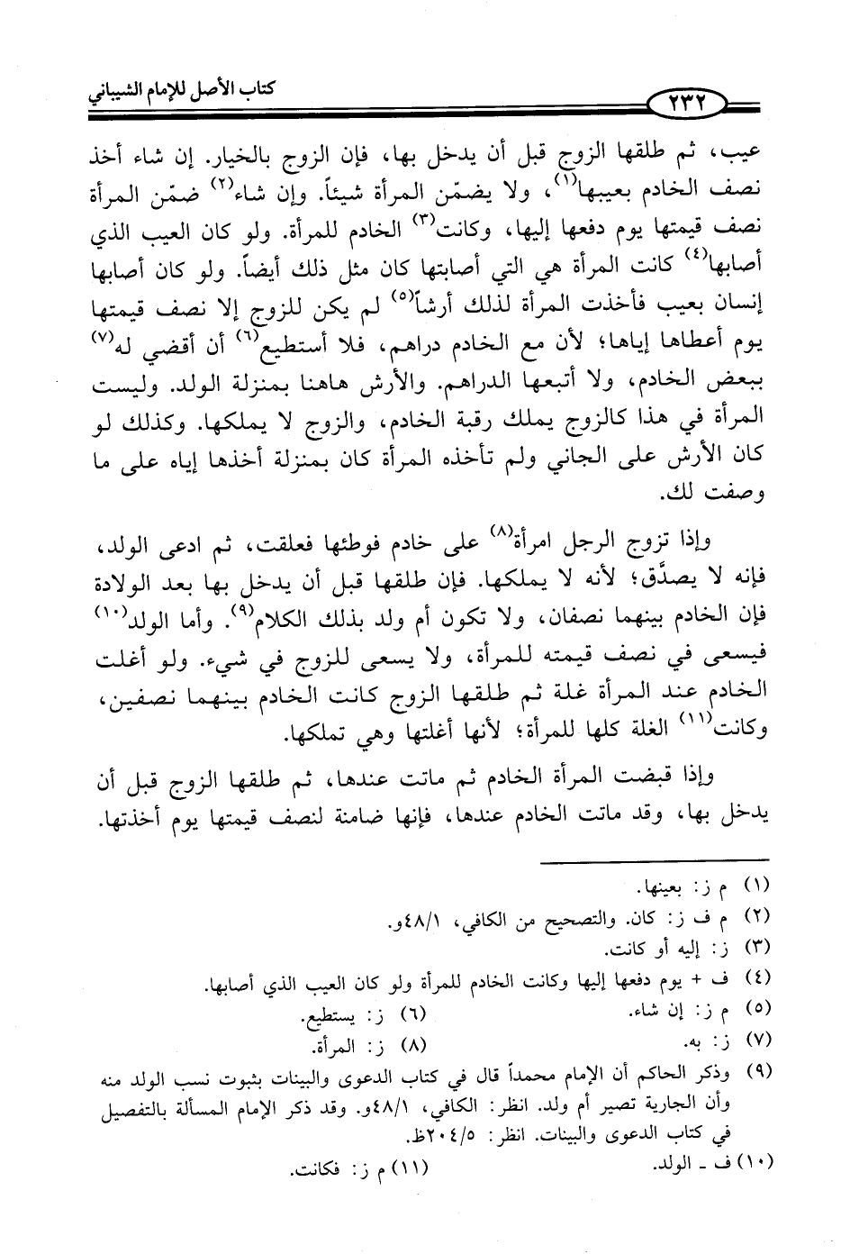 (¬9) وذكر الحاكم أن الإمام محمداً قال في كتاب الدعوى والبينات بثبوت نسب الولد منه وأن الجارية تصير أم ولد. انظر: الكافي، 1/ 48 و. وقد ذكر الإمام المسألة بالتفصيل في كتاب الدعوى والبينات. انظر: 5/ 204 ظ.