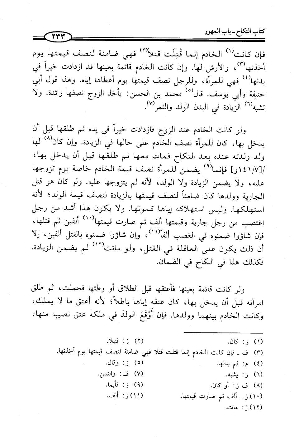 فإن كانت (¬1) الخادم إنما قُتِلَت قتلًا (¬2) فهي ضامنة لنصف قيمتها يوم أخذتها (¬3)، والأرش لها. وإن كانت الخادم قائمة بعينها قد ازدادت خيراً في بدنها (¬4) فهي للمرأة، وللرجل نصف قيمتها يوم أعطاها إياه. وهذا قول أبي حنيفة وأبي يوسف. قال (¬5) محمد بن الحسن: يأخذ الزوج نصفها زائدة. ولا تشبه (¬6) الزيادة في البدن الولد والثمر (¬7).