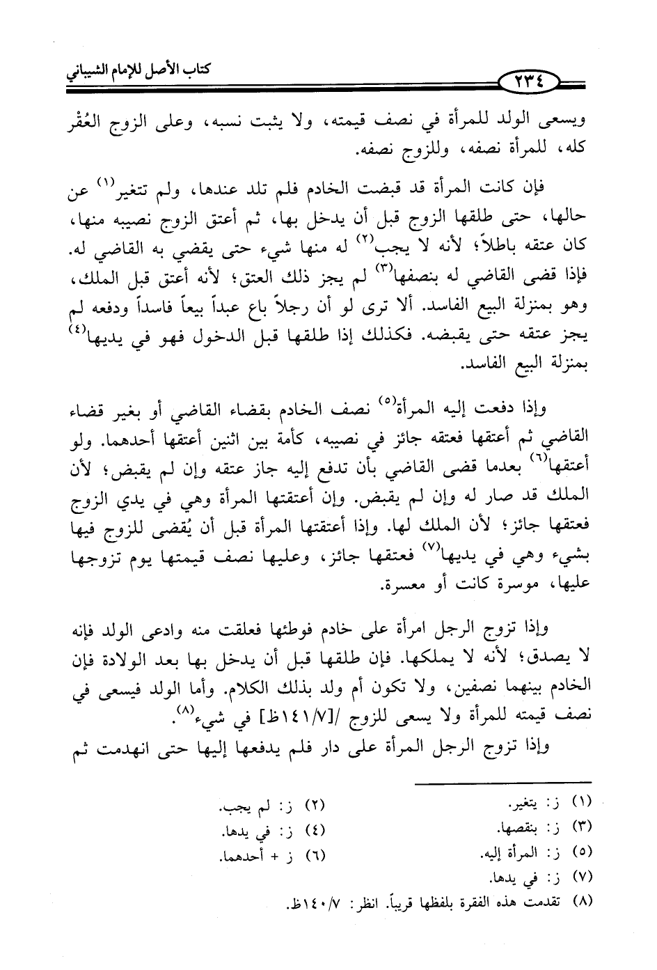 فإن كانت المرأة قد قبضت الخادم فلم تلد عندها، ولم تتغير (¬1) عن حالها، حتى طلقها الزوج قبل أن يدخل بها، ثم أعتق الزوج نصيبه منها، كان عتقه باطلاً؛ لأنه لا يجب (¬2) له منها شيء حتى يقضي به القاضي له. فإذا قضى القاضي له بنصفها (¬3) لم يجز ذلك العتق؛ لأنه أعتق قبل الملك، وهو بمنزلة البيع الفاسد. ألا ترى لو أن رجلاً باع عبداً بيعاً فاسداً ودفعه لم يجز عتقه حتى يقبضه. فكذلك إذا طلقها قبل الدخول فهو في يديها (¬4) بمنزلة البيع الفاسد.
