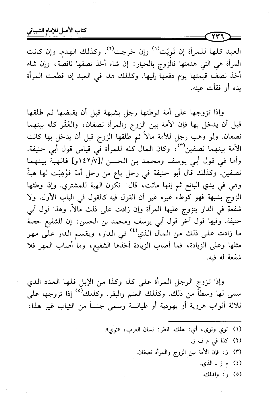 وإذا تزوجها على أمة فوطئها رجل بشبهة قبل أن يقبضها ثم طلقها قبل أن يدخل بها فإن الأمة بين الزوج والمرأة نصفان، والعُقْر كله بينهما نصفان. ولو وهب رجل للأمة مالاً ثم طلقها الزوج قبل أن يدخل بها كانت الأمة بينهما نصفين (¬3)، وكان المال كله للمرأة في قياس قول أبي حنيفة. وأما في قول أبي يوسف ومحمد بن الحسن فالهبة بينهما نصفين. وكذلك قال أبو حنيفة في رجل باع من رجل أمة فوُهِبَت لها هبةٌ وهي في يدي البائع ثم إنها ماتت، قال: تكون الهبة للمشتري. وإذا وطئها الزوج بشبهة فهو كوطء غيره غير أن القول فيه كالقول في الباب الأول. ولا شفعة في الدار يتزوج عليها المرأة وإن زادت على ذلك مالاً. وهذا قول أبي حنيفة. وفيها قول آخر قول أبي يوسف ومحمد بن الحسن: إن للشفيع حصة ما زادت على ذلك من المال الذي (¬4) في الدار، ويقسم الدار على مهر مثلها وعلى الزيادة، فما أصاب الزيادة أخذها الشفيع، وما أصاب المهر فلا شفعة له فيه.