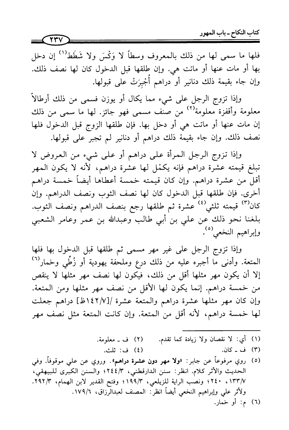 (¬5) روي مرفوعاً عن جابر: "ولا مهر دون عشرة دراهم". وروي عن علي موقوفاً. وفي الحديث والأثر كلام. انظر: سنن الدارقطني، 3/ 244؛ والسنن الكبرى للبيهقي، 7/ 133، 240؛ ونصب الراية للزيلعي، 3/ 199؛ وفتح القدير لابن الهمام، 3/ 292. ولأثر علي وإبراهيم النخعي أيضاً انظر: المصنف لعبد الرزاق، 6/ 179.