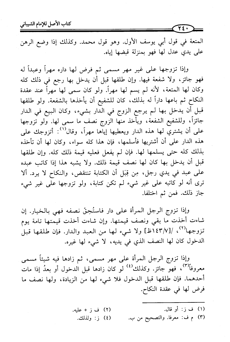 وإذا تزوجها على غير مهر مسمى ثم فرض لها داره مهراً وعبداً له فهو جائز، ولا شفعة فيها. وإن طلقها قبل أن يدخل بها رجع في ذلك كله وكان لها المتعة، لأنه لم يسم لها مهراً. ولو كان سمى لها مهراً عند عقدة النكاح ثم باعها داراً له بذلك، كان للشفيع أن يأخذها بالشفعة. ولوطلقها قبل أن يدخل بها لم يرجع الزوج في الدار بشيء، وكان البيع في الدار جائزاً، وللشفيع الشفعة، ويأخذ منها الزوج نصف ما سمى لها. ولو تزوجها على أن يشتري لها هذه الدار ويعطيها إياها مهراً، وقال (¬1): أتزوجك على هذه الدار على أن أشتريها فأسلمها، فإن هذا كله سواء، وكان لها أن تأخذه بذلك كله حتى يسلمها لها. فإن لم يفعل فعليه قيمة ذلك كله. وإن طلقها قبل أن يدخل بها كان لها نصف قيمة ذلك. ولا يشبه هذا إذا كاتب عبده على عبد في يدي رجل، مِن قِبَل أن الكتابة تنتقض، والنكاح لا يرد. ألا ترى أنه لو كاتبه على غير شيء لم تكن كتابة، ولو تزوجها على غير شيء جاز ذلك. فمن ثم اختلفا.