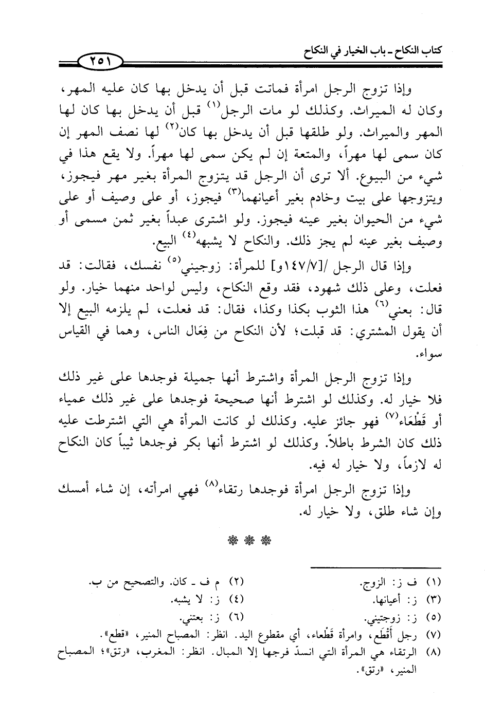 وإذا تزوج الرجل المرأة واشترط أنها جميلة فوجدها على غير ذلك فلا خيار له. وكذلك لو اشترط أنها صحيحة فوجدها على غير ذلك عمياء أو قَطْعَاء (¬7) فهو جائز عليه. وكذلك لو كانت المرأة هي التي اشترطت عليه ذلك كان الشرط باطلاً. وكذلك لو اشترط أنها بكر فوجدها ثيباً كان النكاح له لازماً، ولا خيار له فيه.