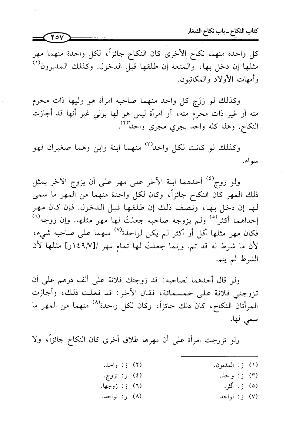 ولو زوج (¬4) أحدهما ابنة الآخر على مهر على أن يزوج الآخر بمثل ذلك المهر كان النكاح جائزاً، وكان لكل واحدة منهما من المهر ما سمى لها إن دخل بها، ونصف ذلك إن طلقها قبل الدخول. فإن كان مهر إحداهما أكثر (¬5) ولم يزوجه صاحبه جعلتُ لها مهر مثلها. وإن زوجه (¬6) فكان مهر مثلها أقل أو أكثر لم يكن لواحدة (¬7) منهما على صاحبه شيء، لأن ما شرط له قد تم. وإنما جعلتُ لها تمام مهر مثلها لأن الشرط لم يتم.