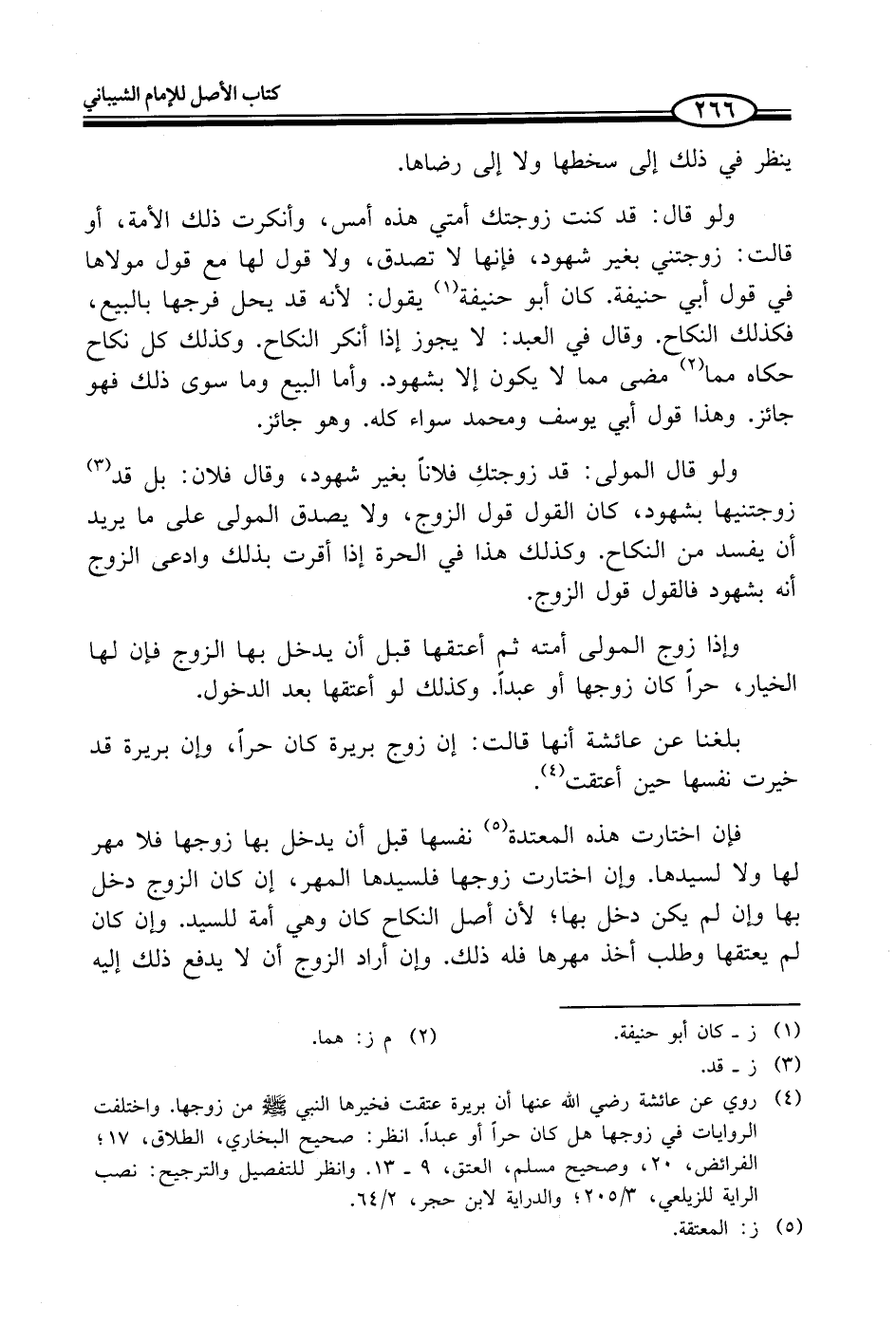 (¬4) روي عن عائشة - رضي الله عنها - أن بريرة عتقت فخيرها النبي - صلى الله عليه وسلم - من زوجها. واختلفت الروايات في زوجها هل كان حراً أو عبداً. انظر: صحيح البخاري، الطلاق، 17؛ الفرائض، 20، وصحيح مسلم، العتق، 9 - 13. وانظر للتفصيل والترجيح: نصب الراية للزيلعي، 3/ 205؛ والدراية لابن حجر، 2/ 64.