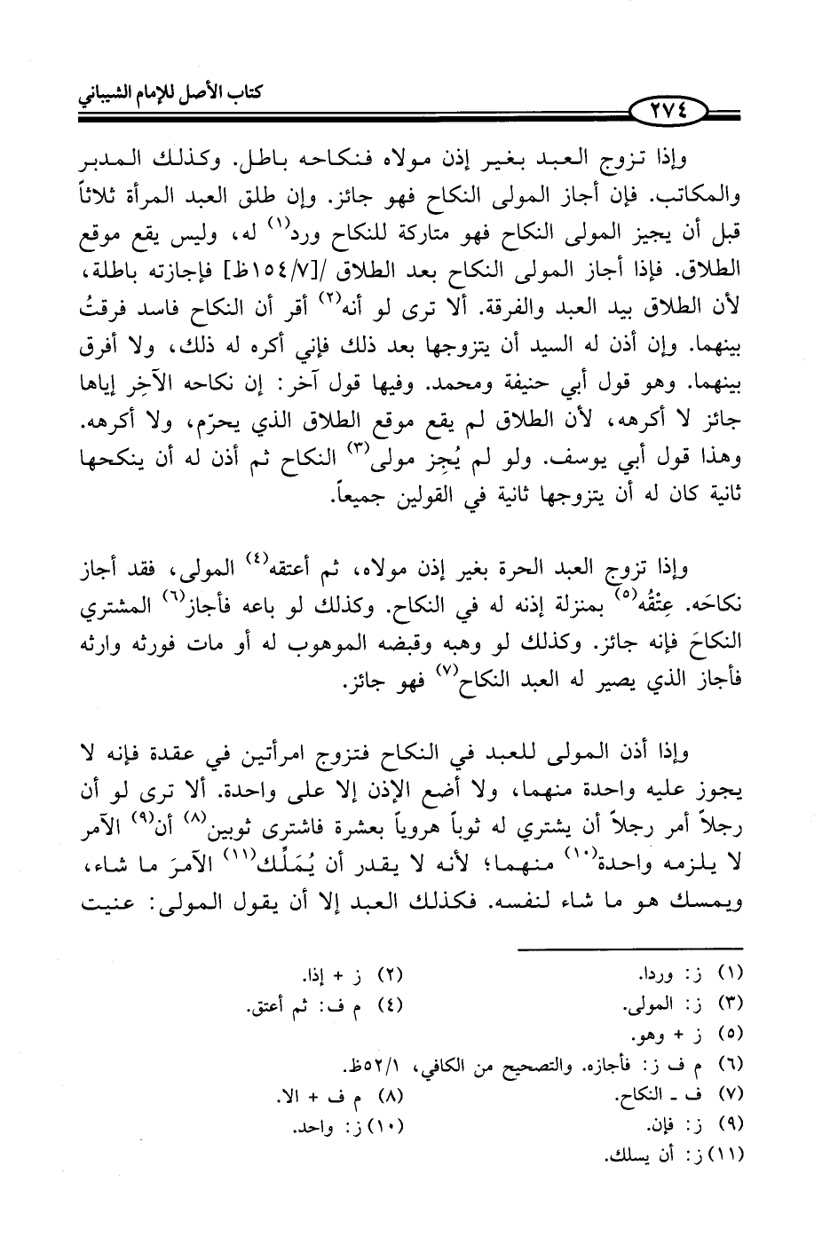 وإذا تزوج العبد بغير إذن مولاه فنكاحه باطل. وكذلك المدبر والمكاتب. فإن أجاز المولى النكاح فهو جائز. وإن طلق العبد المرأة ثلاثاً قبل أن يجيز المولى النكاح فهو متاركة للنكاح ورد (¬1) له، وليس يقع موقع الطلاق. فإذا أجاز المولى النكاح بعد الطلاق فإجازته باطلة، لأن الطلاق بيد العبد والفرقة. ألا ترى لو أنه (¬2) أقر أن النكاح فاسد فرقتُ بينهما. وإن أذن له السيد أن يتزوجها بعد ذلك فإني أكره له ذلك، ولا أفرق بينهما. وهو قول أبي حنيفة ومحمد. وفيها قول آخر: إن نكاحه الآخِر إياها جائز لا أكرهه، لأن الطلاق لم يقع موقع الطلاق الذي يحرّم، ولا أكرهه. وهذا قول أبي يوسف. ولو لم يُجِز مولى (¬3) النكاح ثم أذن له أن ينكحها ثانية كان له أن يتزوجها ثانية في القولين جميعاً.