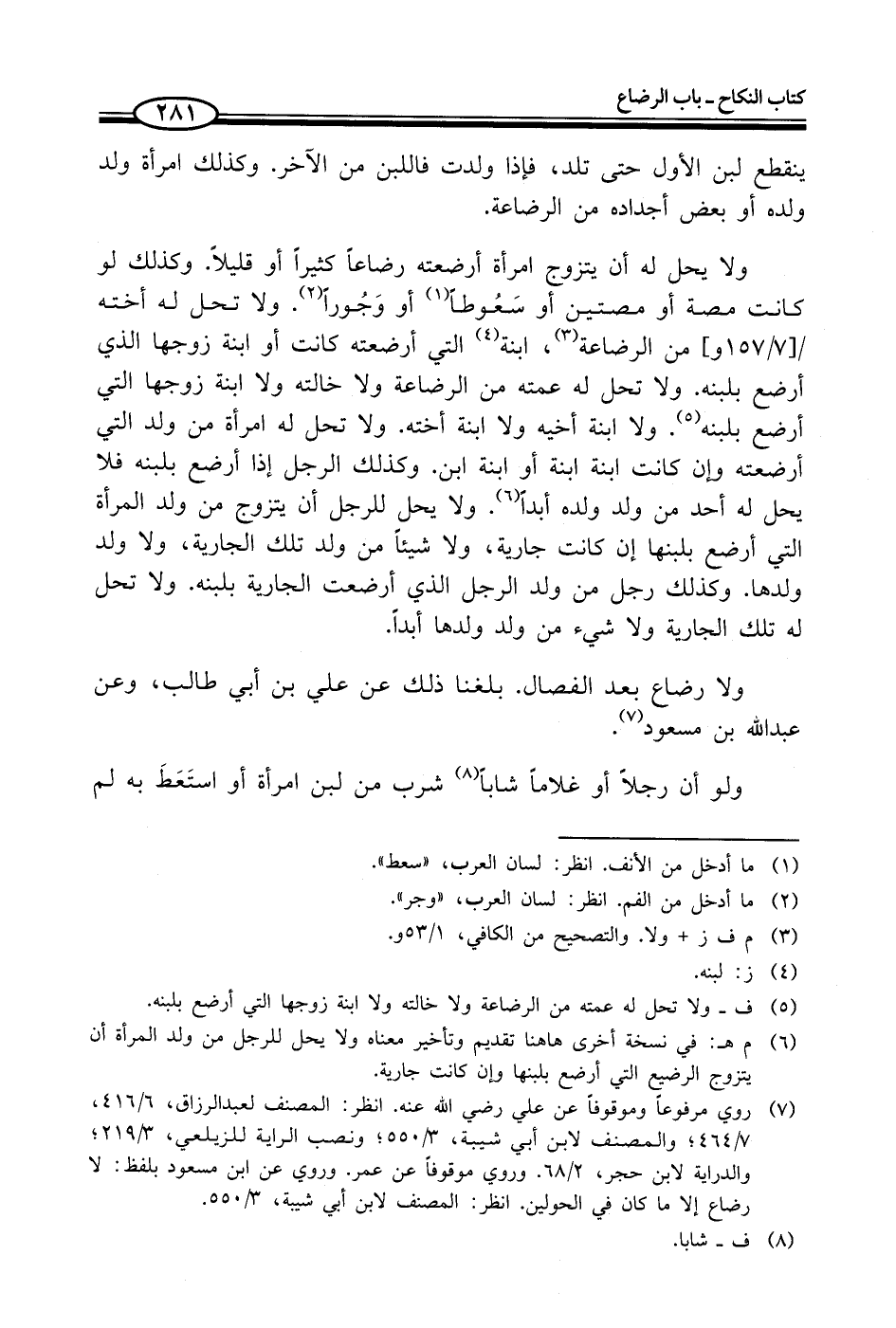 (¬6) م هـ: في نسخة أخرى هاهنا تقديم وتأخير معناه ولا يحل للرجل من ولد المرأة أن يتزوج الرضيع التي أرضع بلبنها وإن كانت جارية.