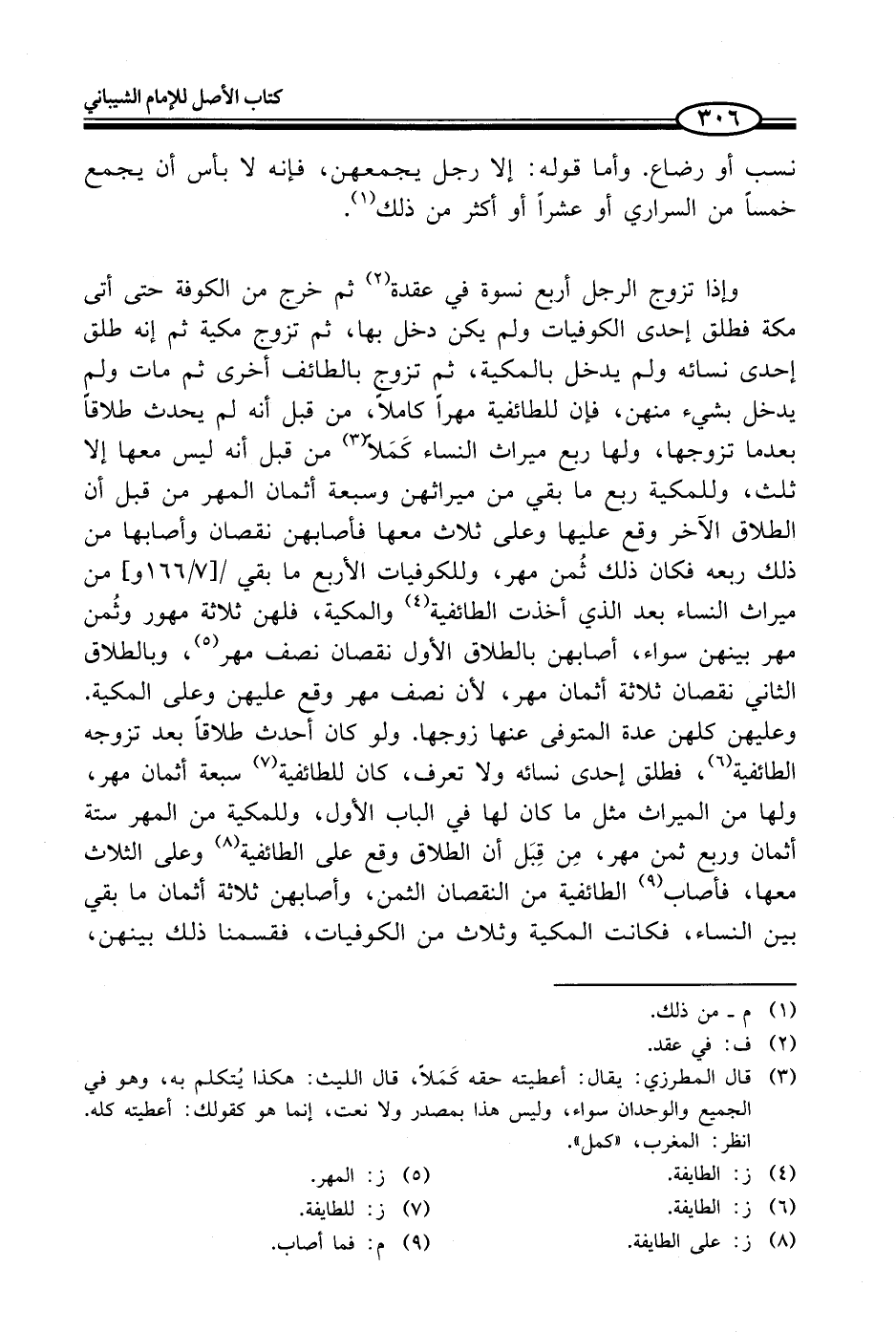 وإذا تزوج الرجل أربع نسوة في عقدة (¬2) ثم خرج من الكوفة حتى أتى مكة فطلق إحدى الكوفيات ولم يكن دخل بها، ثم تزوج مكية ثم إنه طلق إحدى نسائه ولم يدخل بالمكية، ثم تزوج بالطائف أخرى ثم مات ولم يدخل بشيء منهن، فإن للطائفية مهراً كاملاً، من قبل أنه لم يحدث طلاقاً بعدما تزوجها، ولها ربع ميراث النساء كَمَلاً (¬3) من قبل أنه ليس معها إلا ثلث، وللمكية ربع ما بقي من ميراثهن وسبعة أثمان المهر من قبل أن الطلاق الآخر وقع عليها وعلى ثلاث معها فأصابهن نقصان وأصابها من ذلك ربعه فكان ذلك ثُمن مهر، وللكوفيات الأربع ما بقي من ميراث النساء بعد الذي أخذت الطائفية (¬4) والمكية، فلهن ثلاثة مهور وثُمن مهر بينهن سواء، أصابهن بالطلاق الأول نقصان نصف مهر (¬5)، وبالطلاق الثاني نقصان ثلاثة أثمان مهر، لأن نصف مهر وقع عليهن وعلى المكية. وعليهن كلهن عدة المتوفى عنها زوجها. ولو كان أحدث طلاقاً بعد تزوجه الطائفية (¬6)، فطلق إحدى نسائه ولا تعرف، كان للطائفية (¬7) سبعة أثمان مهر، ولها من الميراث مثل ما كان لها في الباب الأول، وللمكية من المهر ستة أثمان وربع ثمن مهر، مِن قِبَل أن الطلاق وقع على الطائفية (¬8) وعلى الثلاث معها، فأصاب (¬9) الطائفية من النقصان الثمن، وأصابهن ثلاثة أثمان ما بقي بين النساء، فكانت المكية وثلاث من الكوفيات، فقسمنا ذلك بينهن،