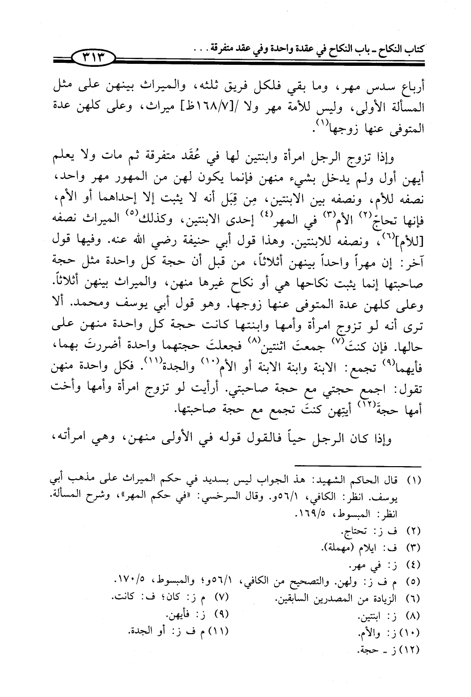 (¬1) قال الحاكم الشهيد: هذ الجواب ليس بسديد في حكم الميراث على مذهب أبي يوسف. انظر: الكافي، 1/ 56 و. وقال السرخسي: "في حكم المهر"، وشرح المسألة. انظر: المبسوط، 5/ 169.
