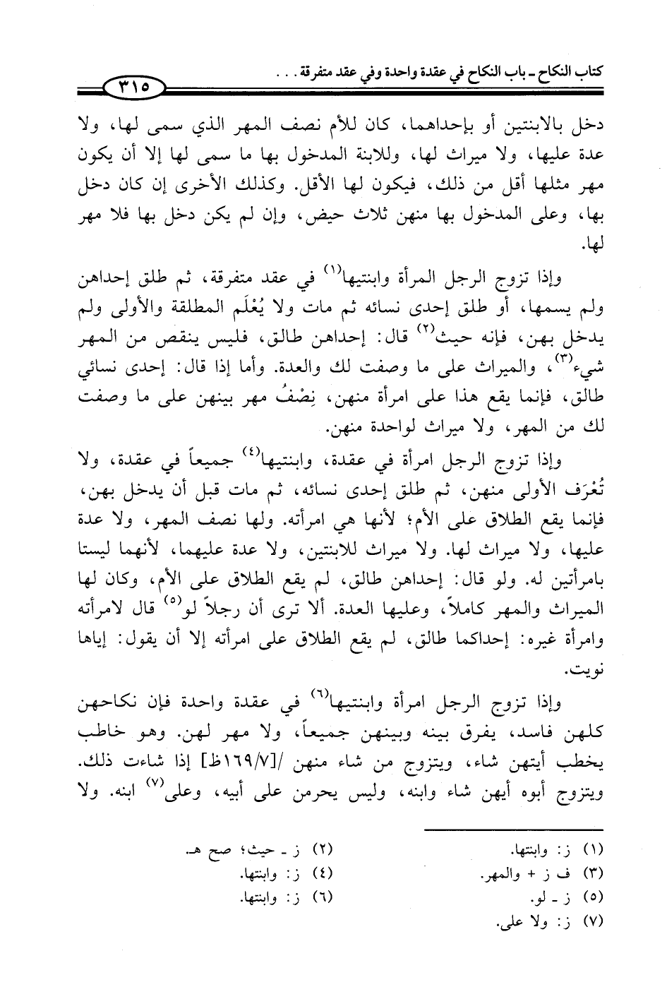 وإذا تزوج الرجل امرأة في عقدة، وابنتيها (¬4) جميعاً في عقدة، ولا تُعْرَف الأولى منهن، ثم طلق إحدى نسائه، ثم مات قبل أن يدخل بهن، فإنما يقع الطلاق على الأم؛ لأنها هي امرأته. ولها نصف المهر، ولا عدة عليها، ولا ميراث لها. ولا ميراث للابنتين، ولا عدة عليهما، لأنهما ليستا بامرأتين له. ولو قال: إحداهن طالق، لم يقع الطلاق على الأم، وكان لها الميراث والمهر كاملاً، وعليها العدة. ألا ترى أن رجلاً لو (¬5) قال لامرأته وامرأة غيره: إحداكما طالق، لم يقع الطلاق على امرأته إلا أن يقول: إياها نويت.