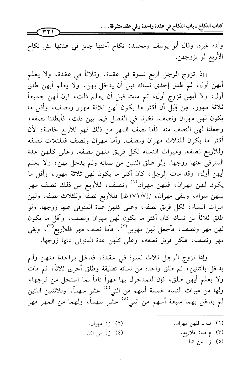وإذا تزوج الرجل أربع نسوة في عقدة، وثلاثاً في عقدة، ولا يعلم أيهن أول، ثم طلق إحدى نسائه قبل أن يدخل بهن، ولا يعلم أيهن طلق أول، ولا أيهن تزوج أول، ثم مات قبل أن يعلم ذلك، فإن لهن جميعاً ثلاثة مهور، مِن قِبَل أن أكثر ما يكون لهن ثلاثة مهور ونصف، وأقل ما يكون لهن مهران ونصف. نظرنا في الفضل فيما بين ذلك، فأبطلنا نصفه، وجعلنا لهن النصف منه. فأما نصف المهر من ذلك فهو للأربع خاصة؛ لأن أكثر ما يكون للثلاث مهران ونصف. وأما مهران ونصف فللثلاث نصفه وللأربع نصفه. وميراث النساء لكل فريق منهن نصفه. وعلى كلهن عدة المتوفى عنها زوجها. ولو طلق اثنتين من نسائه ولم يدخل بهن، ولا يعلم أيهن أول، وقد مات الرجل، كان أكثر ما يكون لهن ثلاثة مهور، وأقل ما يكون لهن مهران، فلهن مهران (¬1) ونصف، للأربع من ذلك نصف مهر بينهن سواء، ويبقى مهران، فللأربع نصفه وللثلاث نصفه. ولهن ميراث النساء، لكل فريق نصفه، وعلى كلهن عدة المتوفى عنها زوجها. ولو طلق ثلاثاً من نسائه كان أكثر ما يكون لهن مهران ونصف، وأقل ما يكون لهن مهر ونصف، فأجعل لهن مهرين (¬2)، فأما نصف مهر فللأربع (¬3)، وبقي مهر ونصف، فلكل فريق نصفه، وعلى كلهن عدة المتوفى عنها زوجها.