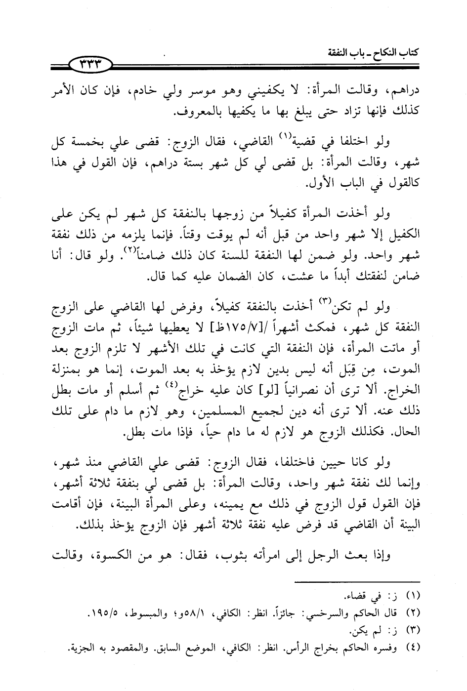 ولو لم تكن (¬3) أخذت بالنفقة كفيلاً، وفرض لها القاضي على الزوج النفقة كل شهر، فمكث أشهراً لا يعطيها شيئاً، ثم مات الزوج أو ماتت المرأة، فإن النفقة التي كانت في تلك الأشهر لا تلزم الزوج بعد الموت، مِن قِبَل أنه ليس بدين لازم يؤخذ به بعد الموت، إنما هو بمنزلة الخراج. ألا ترى أن نصرانياً [لو] كان عليه خراج (¬4) ثم أسلم أو مات بطل ذلك عنه. ألا ترى أنه دين لجميع المسلمين، وهو لازم ما دام على تلك الحال. فكذلك الزوج هو لازم له ما دام حياً، فإذا مات بطل.