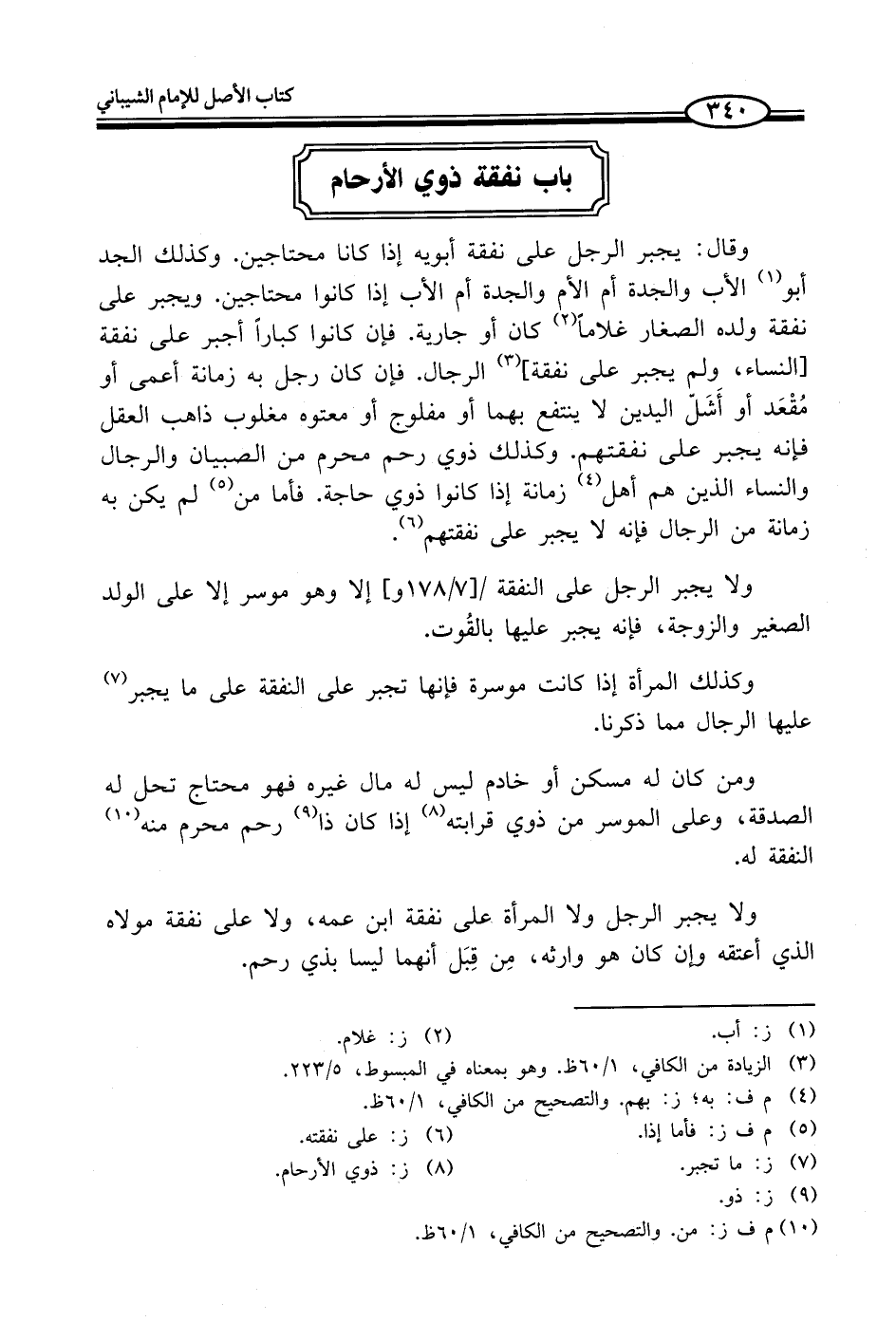 وقال: يجبر الرجل على نفقة أبويه إذا كانا محتاجين. وكذلك الجد أبو (¬1) الأب والجدة أم الأم والجدة أم الأب إذا كانوا محتاجين. ويجبر على نفقة ولده الصغار غلاماً (¬2) كان أو جارية. فإن كانوا كباراً أجبر على نفقة [النساء، ولم يجبر على نفقة] (¬3) الرجال. فإن كان رجل به زمانة أعمى أو مُقْعَد أو أَشَلّ اليدين لا ينتفع بهما أو مفلوج أو معتوه مغلوب ذاهب العقل فإنه يجبر على نفقتهم. وكذلك ذوي رحم محرم من الصبيان والرجال والنساء الذين هم أهل (¬4) زمانة إذا كانوا ذوي حاجة. فأما من (¬5) لم يكن به زمانة من الرجال فإنه لا يجبر على نفقتهم (¬6).