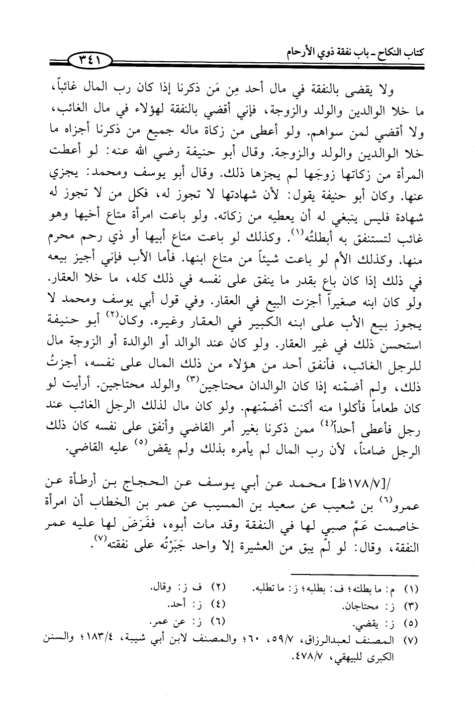 ولا يقضى بالنفقة في مال أحد مِن مَن ذكرنا إذا كان رب المال غائباً، ما خلا الوالدين والولد والزوجة، فإني أقضي بالنفقة لهؤلاء في مال الغائب، ولا أقضي لمن سواهم. ولو أعطى من زكاة ماله جميع من ذكرنا أجزاه ما خلا الوالدين والولد والزوجة. وقال أبو حنيفة - رضي الله عنه -: لو أعطت المرأة من زكاتها زوجَها لم يجزها ذلك. وقال أبو يوسف ومحمد: يجزي عنها. وكان أبو حنيفة يقول: لأن شهادتها لا تجوز له، فكل من لا تجوز له شهادة فليس ينبغي له أن يعطيه من زكاته. ولو باعت امرأة متاع أخيها وهو غائب لتستنفق به أبطلتُه (¬1). وكذلك لو باعت متاع أبيها أو ذي رحم محرم منها. وكذلك الأم لو باعت شيئاً من متاع ابنها. فأما الأب فإني أجيز بيعه في ذلك إذا كان باع بقدر ما ينفق على نفسه في ذلك كله، ما خلا العقار. ولو كان ابنه صغيراً أجزت البيع في العقار. وفي قول أبي يوسف ومحمد لا يجوز بيع الأب على ابنه الكبير في العقار وغيره. وكان (¬2) أبو حنيفة استحسن ذلك في غير العقار. ولو كان عند الوالد أو الوالدة أو الزوجة مال للرجل الغائب، فأنفق أحد من هؤلاء من ذلك المال على نفسه، أجزتُ ذلك، ولم أضمّنه إذا كان الوالدان محتاجين (¬3) والولد محتاجين. أرأيت لو كان طعاماً فأكلوا منه أكنت أضمّنهم. ولو كان مال لذلك الرجل الغائب عند رجل فأعطى أحداً (¬4) ممن ذكرنا بغير أمر القاضي وأنفق على نفسه كان ذلك الرجل ضامناً، لأن رب المال لم يأمره بذلك ولم يقض (¬5) عليه القاضي.
