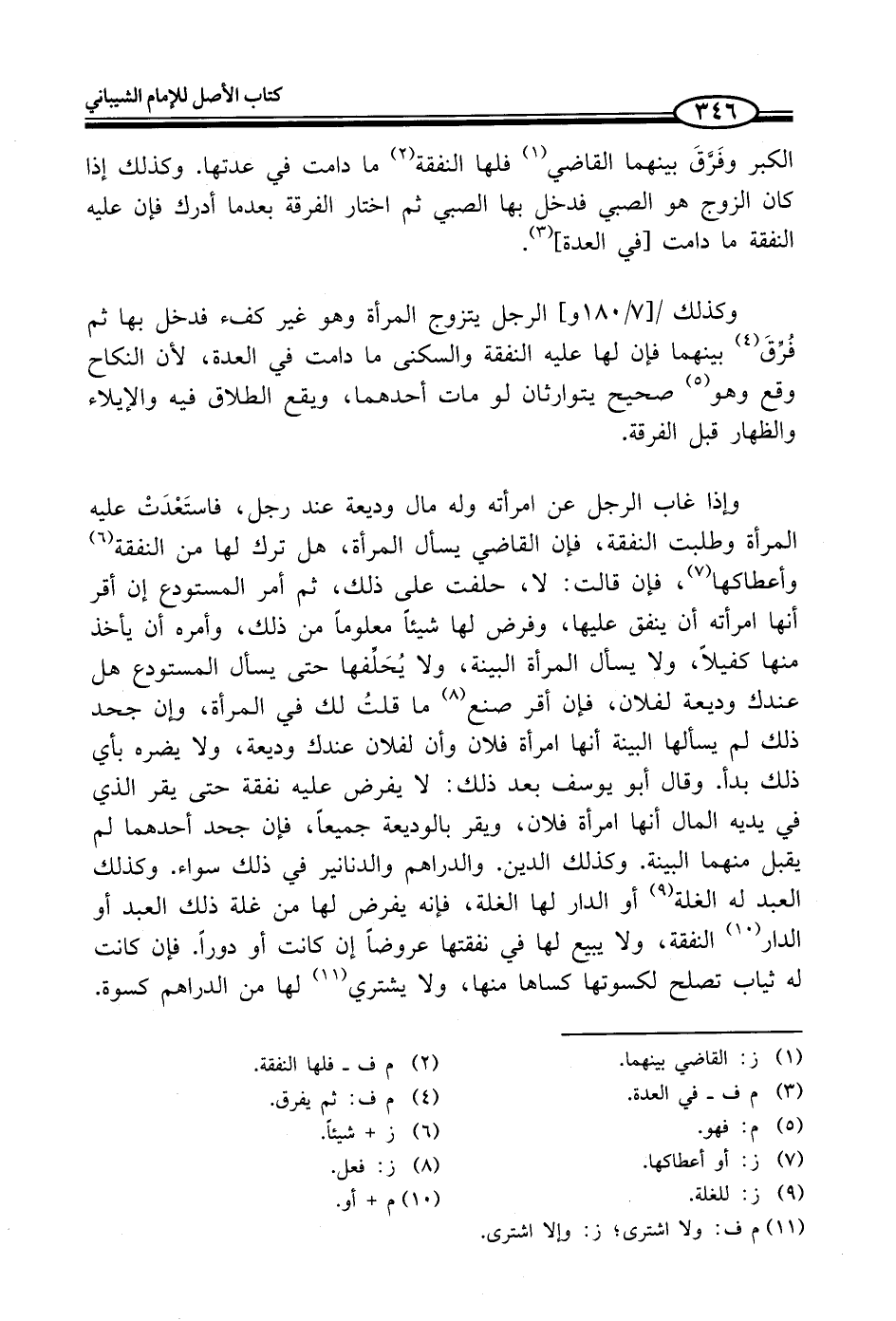 وإذا غاب الرجل عن امرأته وله مال وديعة عند رجل، فاستَعْدَتْ عليه المرأة وطلبت النفقة، فإن القاضي يسأل المرأة، هل ترك لها من النفقة (¬6) وأعطاكها (¬7)، فإن قالت: لا، حلفت على ذلك، ثم أمر المستودع إن أقر أنها امرأته أن ينفق عليها، وفرض لها شيئاً معلوماً من ذلك، وأمره أن يأخذ منها كفيلاً، ولا يسأل المرأة البينة، ولا يُحَلِّفها حتى يسأل المستودع هل عندك وديعة لفلان، فإن أقر صنع (¬8) ما قلتُ لك في المرأة، وإن جحد ذلك لم يسألها البينة أنها امرأة فلان وأن لفلان عندك وديعة، ولا يضره بأي ذلك بدأ. وقال أبو يوسف بعد ذلك: لا يفرض عليه نفقة حتى يقر الذي في يديه المال أنها امرأة فلان، ويقر بالوديعة جميعاً، فإن جحد أحدهما لم يقبل منهما البينة. وكذلك الدين. والدراهم والدنانير في ذلك سواء. وكذلك العبد له الغلة (¬9) أو الدار لها الغلة، فإنه يفرض لها من غلة ذلك العبد أو الدار (¬10) النفقة، ولا يبيع لها في نفقتها عروضاً إن كانت أو دوراً. فإن كانت له ثياب تصلح لكسوتها كساها منها، ولا يشتري (¬11) لها من الدراهم كسوة.