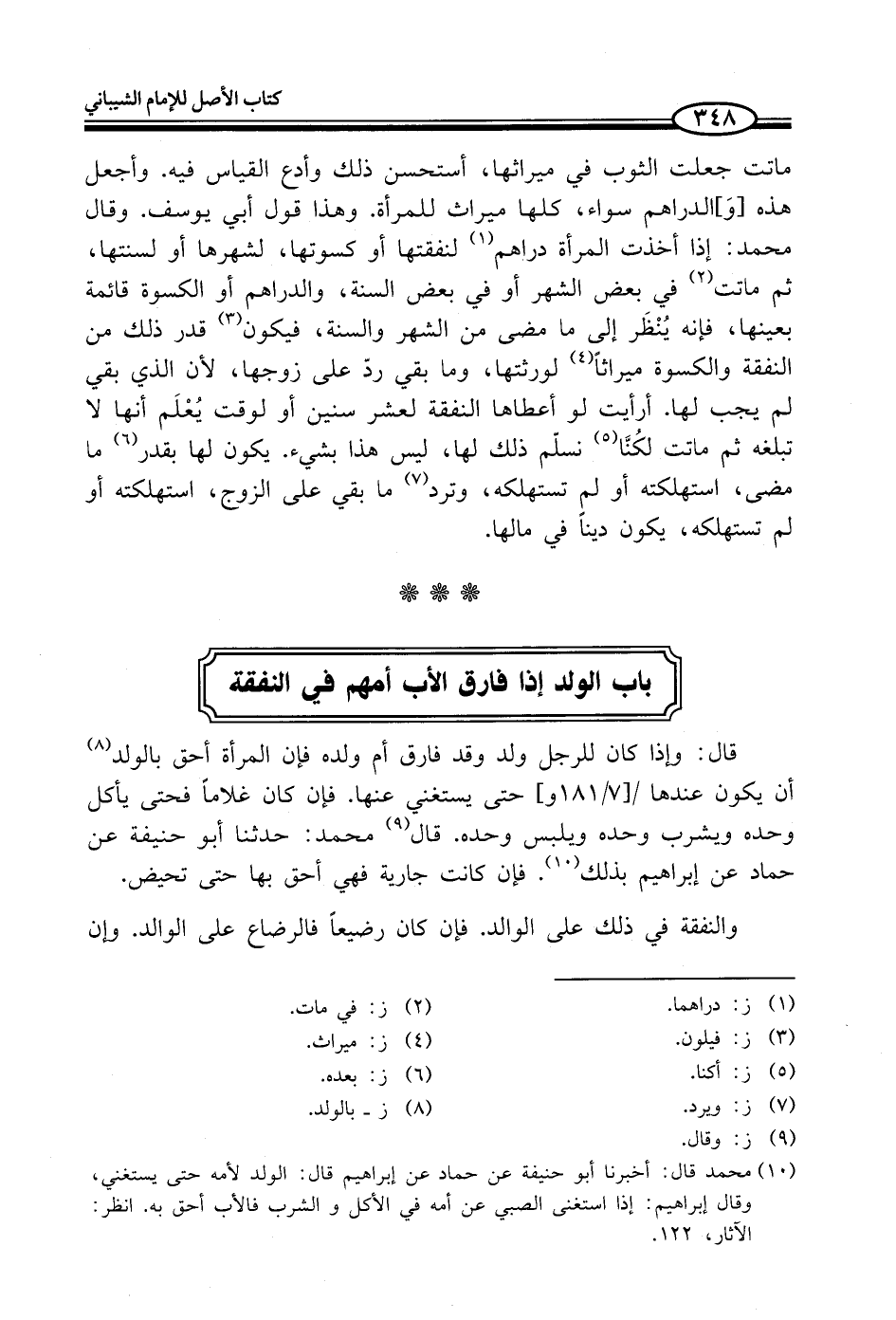 ماتت جعلت الثوب في ميراثها، أستحسن ذلك وأدع القياس فيه. وأجعل هذه [وَ] الدراهم سواء، كلها ميراث للمرأة. وهذا قول أبي يوسف. وقال محمد: إذا أخذت المرأة دراهم (¬1) لنفقتها أو كسوتها، لشهرها أو لسنتها، ثم ماتت (¬2) في بعض الشهر أو في بعض السنة، والدراهم أو الكسوة قائمة بعينها، فإنه يُنْظَر إلى ما مضى من الشهر والسنة، فيكون (¬3) قدر ذلك من النفقة والكسوة ميراثاً (¬4) لورثتها، وما بقي ردّ على زوجها، لأن الذي بقي لم يجب لها. أرأيت لو أعطاها النفقة لعشر سنين أو لوقت يُعْلَم أنها لا تبلغه ثم ماتت لكُنَّا (¬5) نسلّم ذلك لها، ليس هذا بشيء. يكون لها بقدر (¬6) ما مضى، استهلكته أو لم تستهلكه، وترد (¬7) ما بقي على الزوج، استهلكته أو لم تستهلكه، يكون ديناً في مالها.