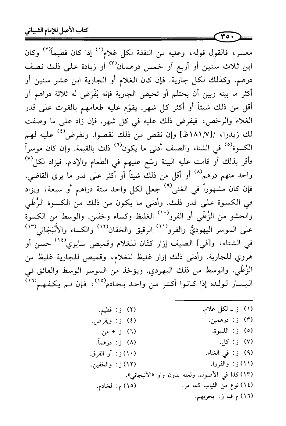 معسر، فالقول قوله، وعليه من النفقة لكل غلام (¬1) إذا كان فطيماً (¬2) وكان ابن ثلاث سنين أو أربع أو خمس درهمان (¬3) أو زيادة على ذلك نصف درهم. وكذلك لكل جارية. فإن كان الغلام أو الجارية ابن عشر سنين أو أكثر ما بينه وبين أن يحتلم أو تحيض الجارية فإنه يُفْرَض له ثلاثة دراهم أو أقل من ذلك شيئاً أو أكثر كل شهر. يقوّم عليه طعامهم بالقوت على قدر الغلاء والرخص، فيفرض ذلك عليه في كل شهر. فإن زاد على ما وصفت لك زيدوا، وإن نقص من ذلك نقصوا. وتفرض (¬4) عليه لهم الكسوة (¬5) في الشتاء والصيف أدنى ما يكون (¬6) ذلك بالقيمة. وإن كان موسراً فأقر بذلك أو قامت عليه البينة وسّع عليهم في الطعام والإدام. فيزاد لكل (¬7) واحد منهم درهم (¬8) أو أقل من ذلك شيئاً أو أكثر على قدر ما يرى القاضي. فإن كان مشهورًا في الغنى (¬9) جعل لكل واحد ستة دراهم أو سبعة، ويزاد في الكسوة على قدر ذلك. وأدنى ما يكون من ذلك من الكسوة الزُّطّي والحشو من الزُّطّي أو الفرو (¬10) الغليظ وكساء وخفين. والوسط من الكسوة على الموسر اليهوديُّ والفرو (¬11) الرقيق والخفان (¬12) والكساء والأَنْبَجَاني (¬13) في الشتاء، و [في] الصيف إزار كتّان للغلام وقميص سابري (¬14) حسن أو هروي للجارية. وأدنى ذلك إزار غليظ للغلام، وقميص للجارية غليظ من الرطّي. والوسط من ذلك اليهودي. ويؤخذ من الموسر الوسط والفائق في اليسار لولده إذا كانوا أكثر من واحد بخادم (¬15)، فإن لم يكفهم (¬16)