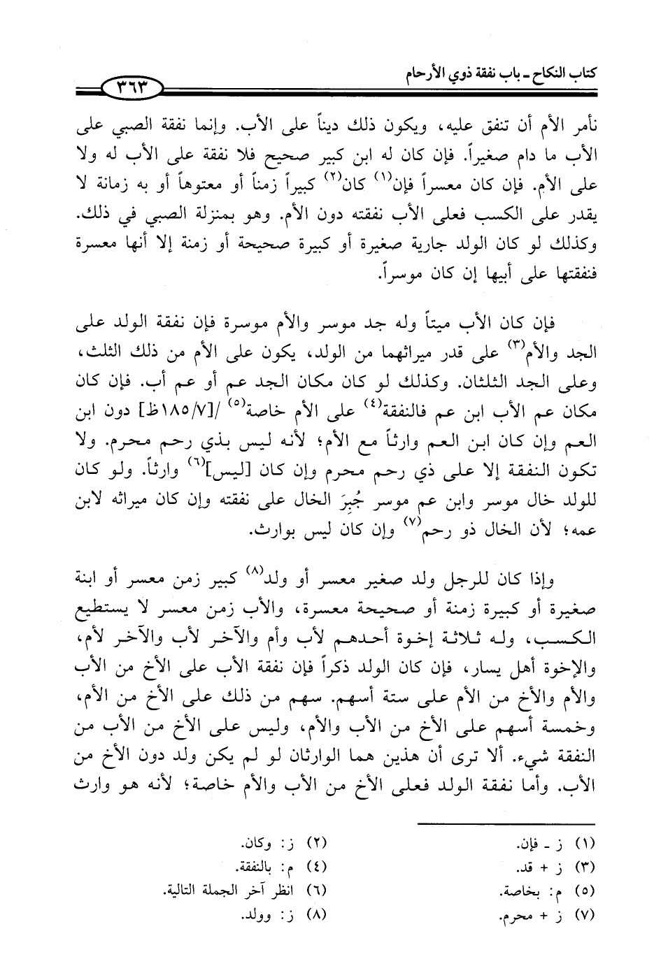 وإذا كان للرجل ولد صغير معسر أو ولد (¬8) كبير زمن معسر أو ابنة صغيرة أو كبيرة زمنة أو صحيحة معسرة، والأب زمن معسر لا يستطيع الكسب، وله ثلاثة إخوة أحدهم لأب وأم والآخر لأب والآخر لأم، والإخوة أهل يسار، فإن كان الولد ذكراً فإن نفقة الأب على الأخ من الأب والأم والأخ من الأم على ستة أسهم. سهم من ذلك على الأخ من الأم، وخمسة أسهم على الأخ من الأب والأم، وليس على الأخ من الأب من النفقة شيء. ألا ترى أن هذين هما الوارثان لو لم يكن ولد دون الأخ من الأب. وأما نفقة الولد فعلى الأخ من الأب والأم خاصة؛ لأنه هو وارث