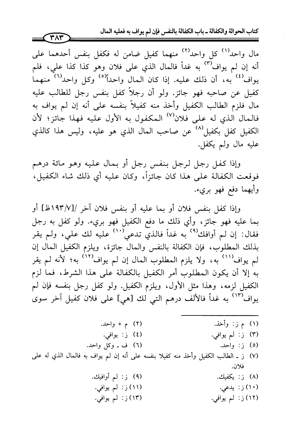 (¬7) ز - الطالب الكفيل وأخذ منه كفيلا بنفسه على أنه إن لم يواف به فالمال الذي له على فلان.