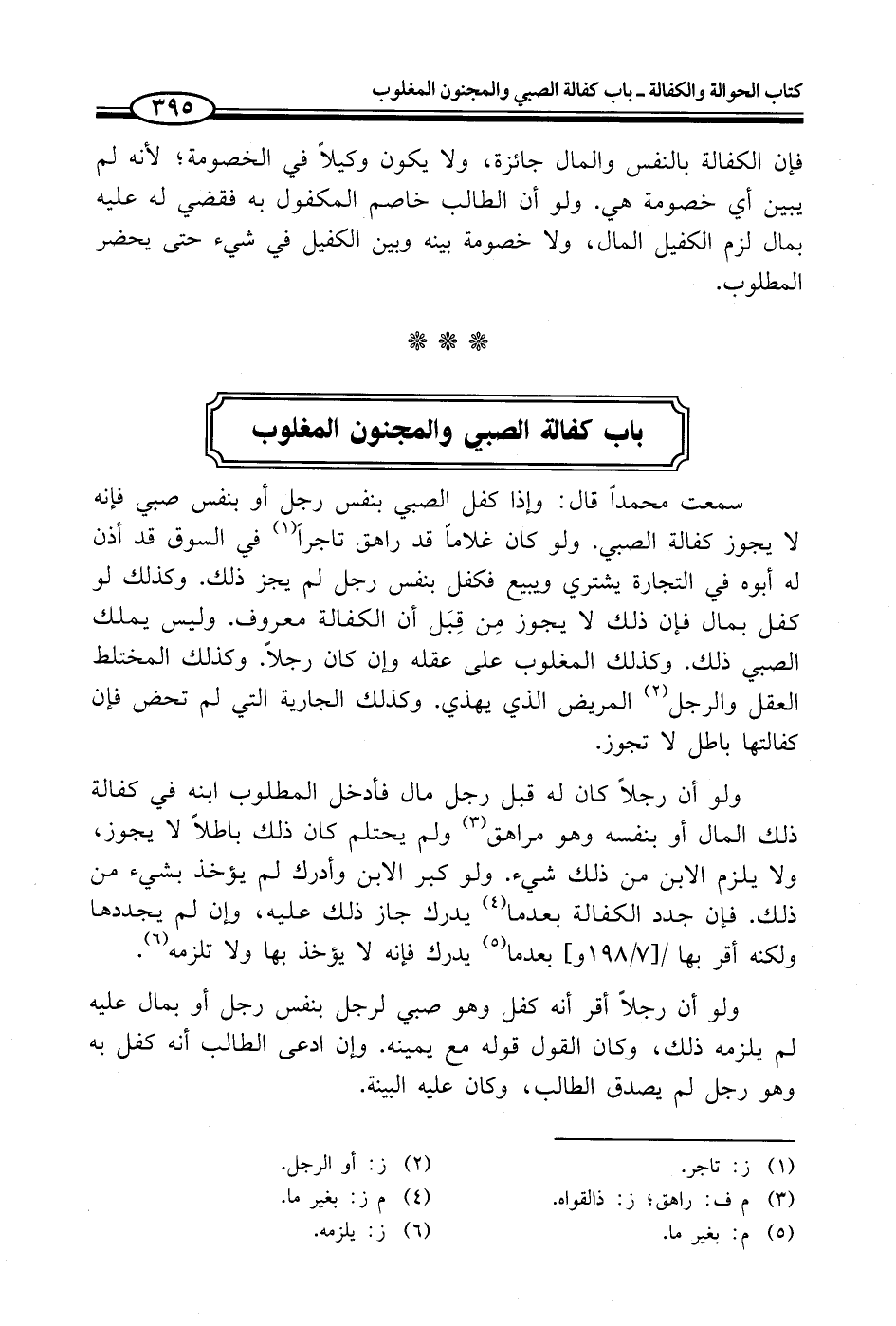 سمعت محمداً قال: وإذا كفل الصبي بنفس رجل أو بنفس صبي فإنه لا يجوز كفالة الصبي. ولو كان غلاماً قد راهق تاجراً (¬1) في السوق قد أذن له أبوه في التجارة يشتري ويبيع فكفل بنفس رجل لم يجز ذلك. وكذلك لو كفل بمال فإن ذلك لا يجوز مِن قِبَل أن الكفالة معروف. وليس يملك الصبي ذلك. وكذلك المغلوب على عقله وإن كان رجلاً. وكذلك المختلط العقل والرجل (¬2) المريض الذي يهذي. وكذلك الجارية التي لم تحض فإن كفالتها باطل لا تجوز.
